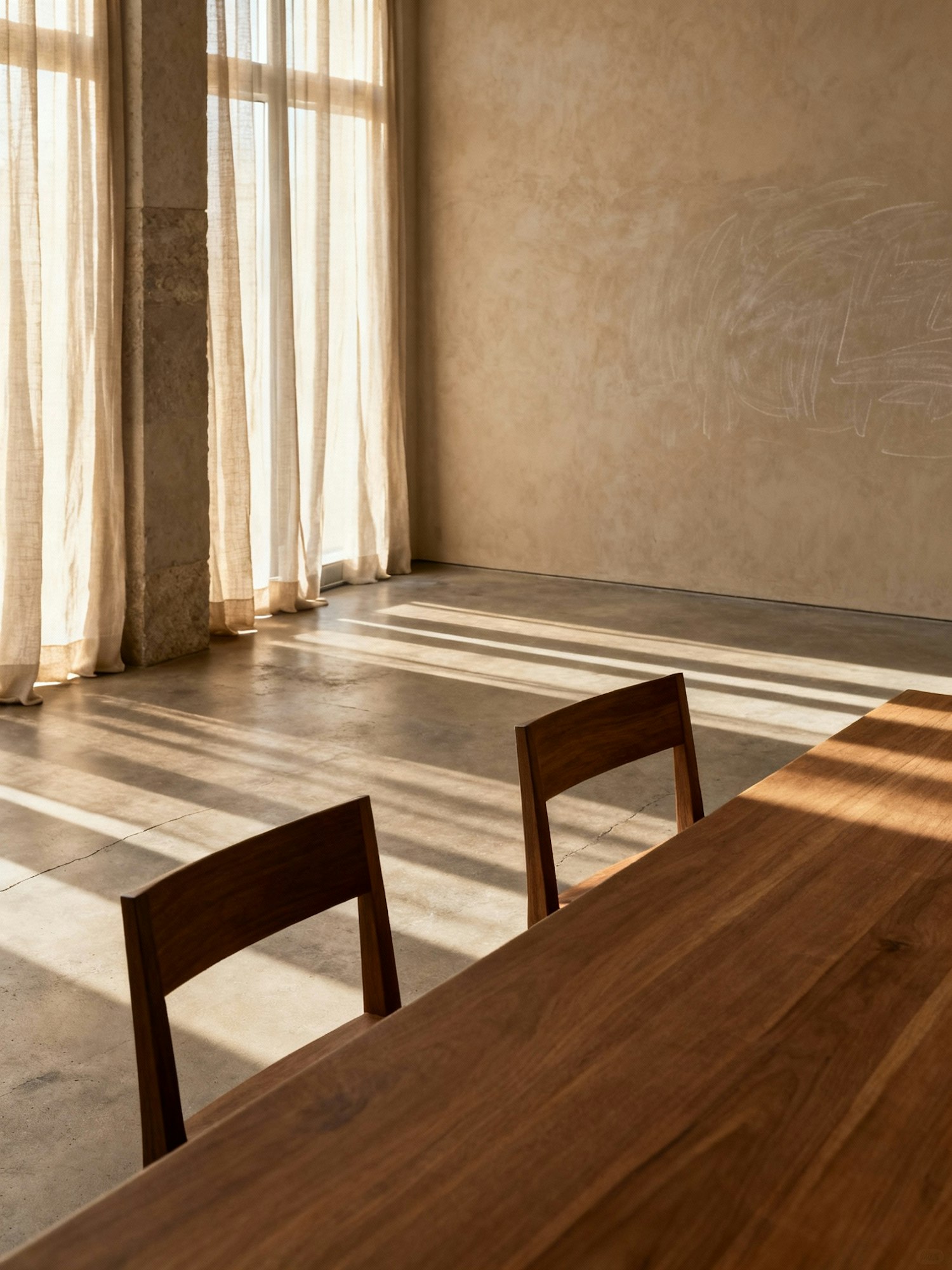 Minimalist interior with a wooden table, chairs, and sunlight streaming through sheer curtains onto a polished concrete floor.