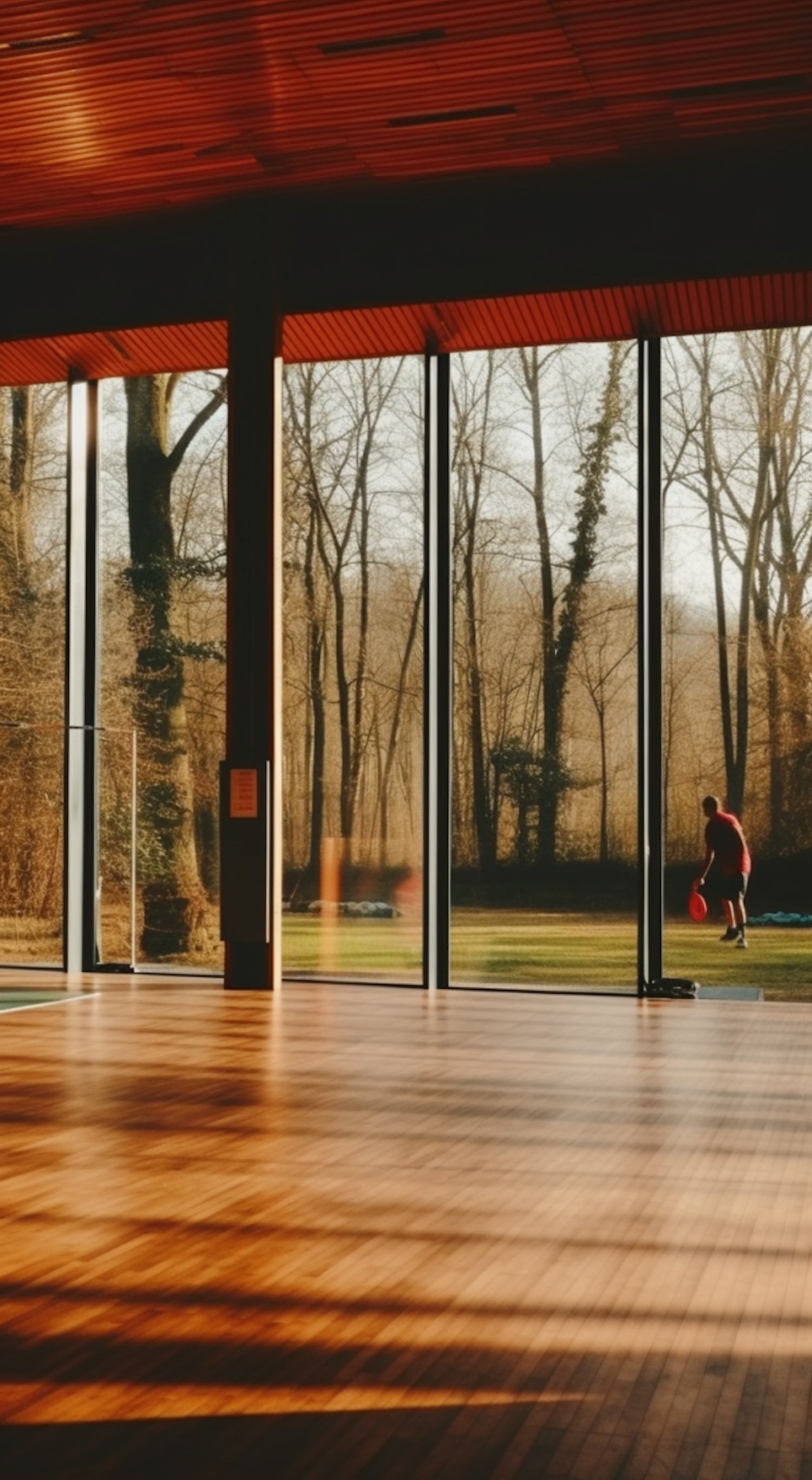 Sunlit indoor space with wooden floors and large windows, overlooking a person playing frisbee outside in a wooded area.