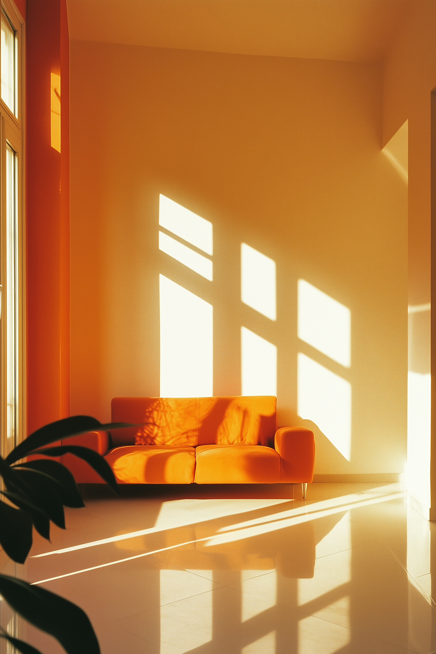Bright orange sofa in a sunlit room with geometric shadows, beige walls, and a polished floor. Minimalist and warm interior design.