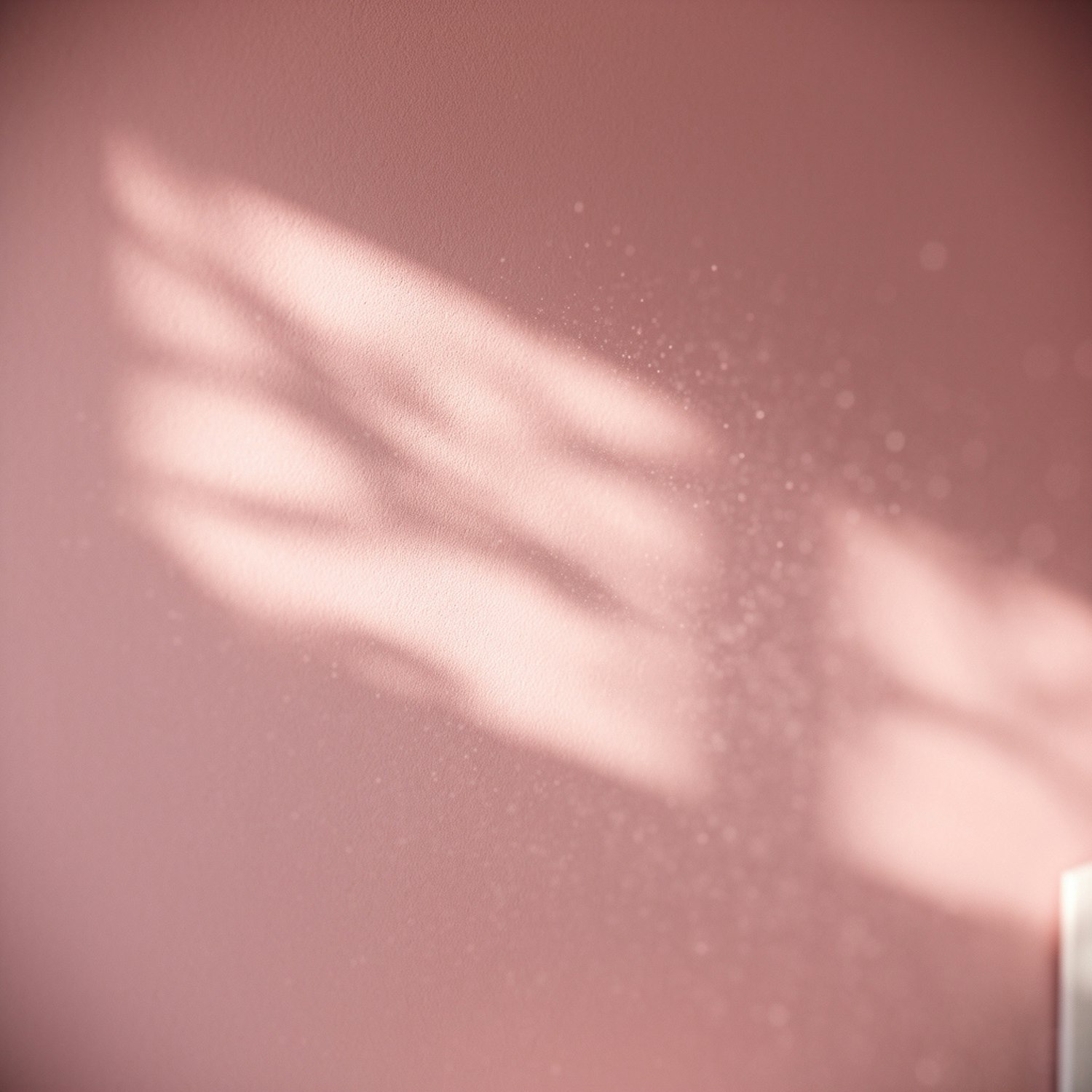Soft sunlight casts blurred shadows on a pastel pink wall, creating a serene and minimalistic atmosphere with warm tones.