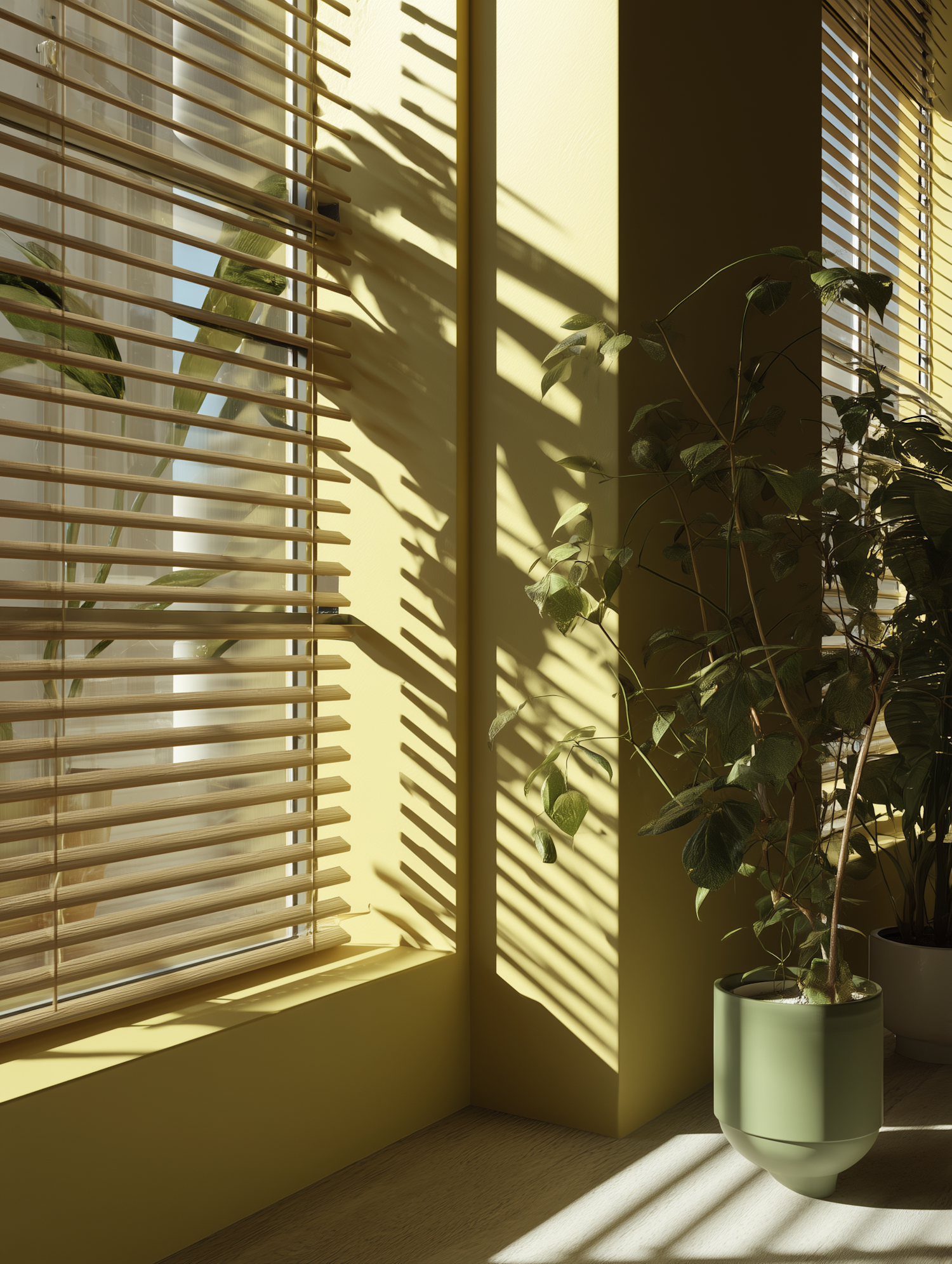 Sunlight filters through wooden blinds onto a yellow wall, highlighting a green potted plant in a serene, natural corner of a room.