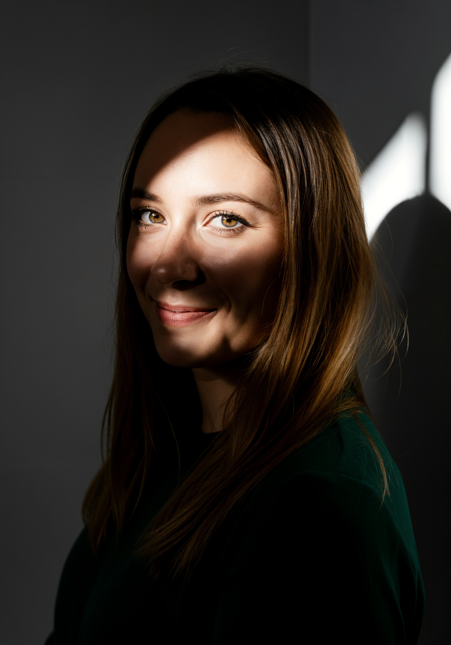 A young woman with green eyes and brown hair is lit by dramatic sunlight, creating striking shadows on her face against a dark background.