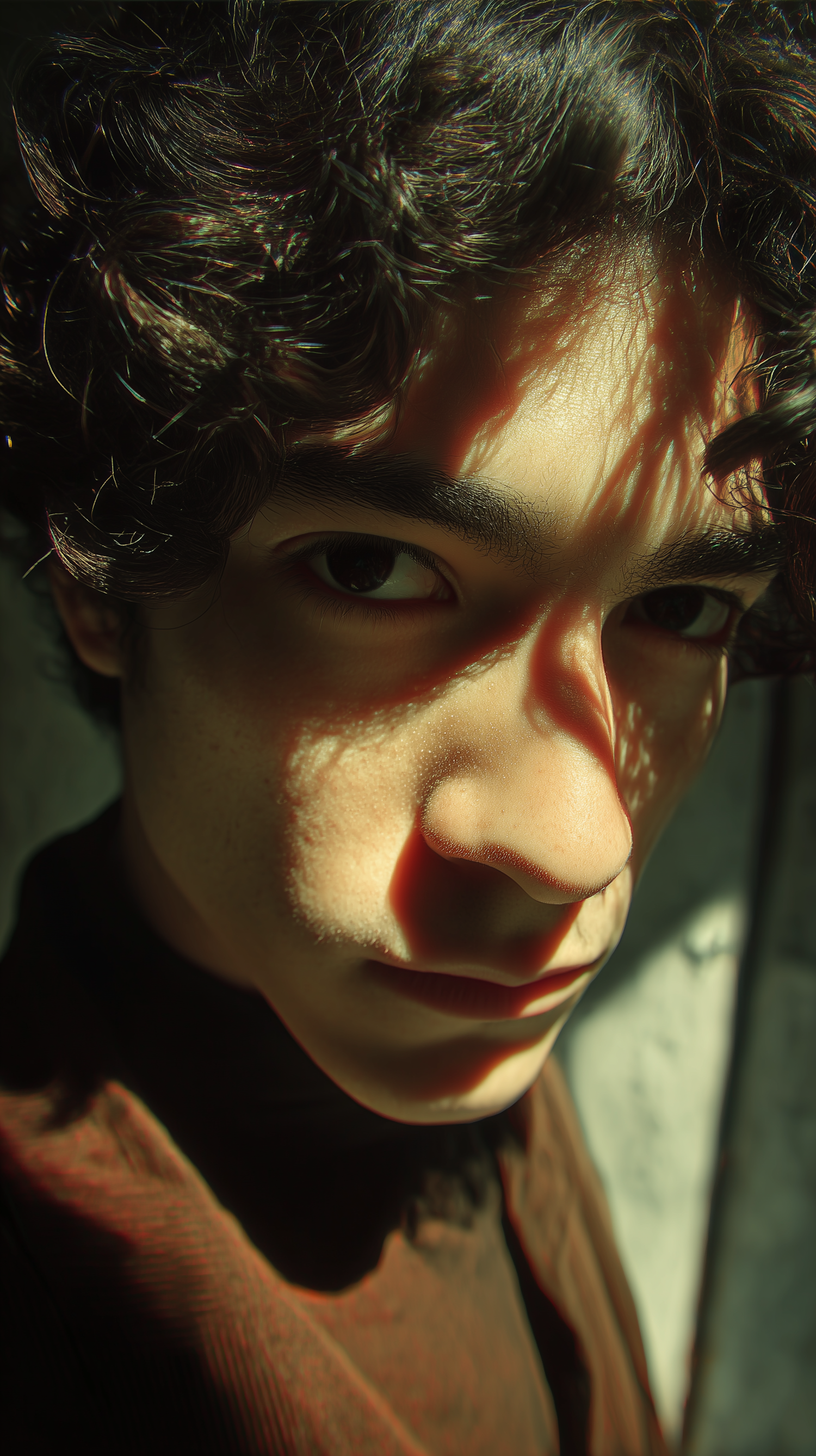 Close-up portrait of a person with curly hair and sunlight casting intricate shadows on their face, creating a dramatic and artistic effect.