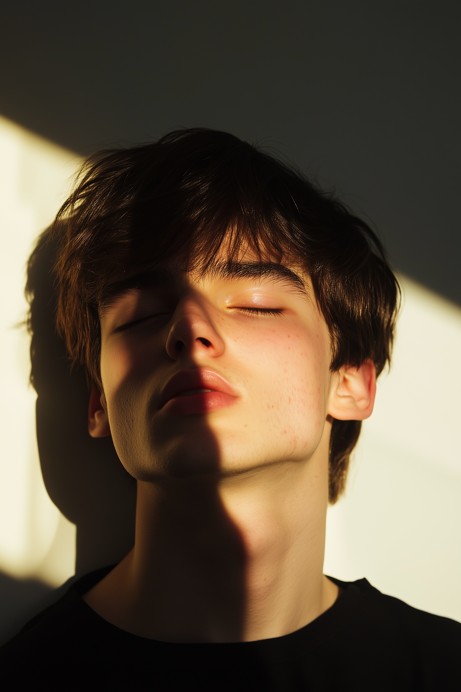 Close-up portrait of a young man with closed eyes, dramatic lighting casting shadows on his face, creating a serene and introspective mood.