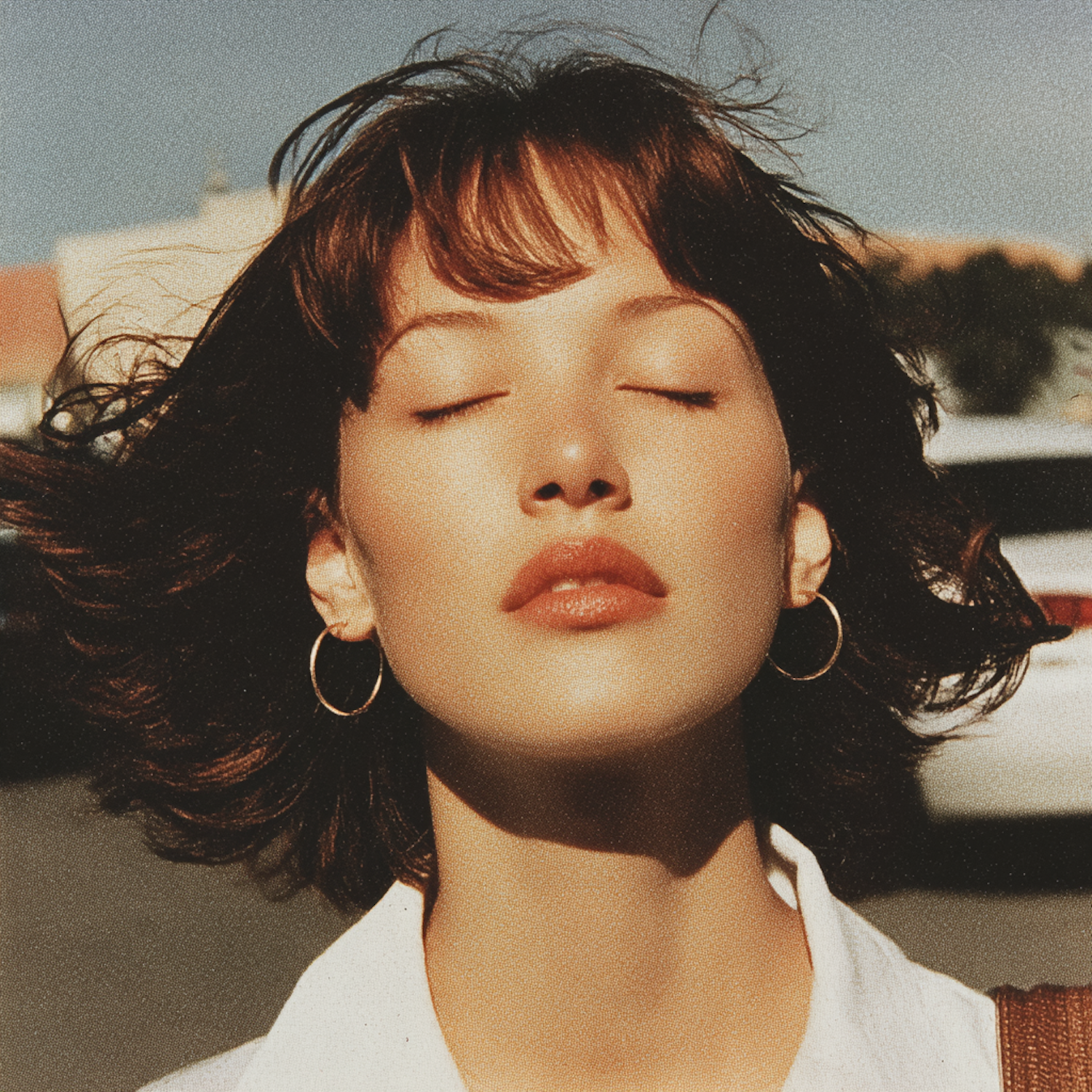 Close-up of a woman with short brown hair, gold hoop earrings, and a white shirt, basking in sunlight with her eyes closed.