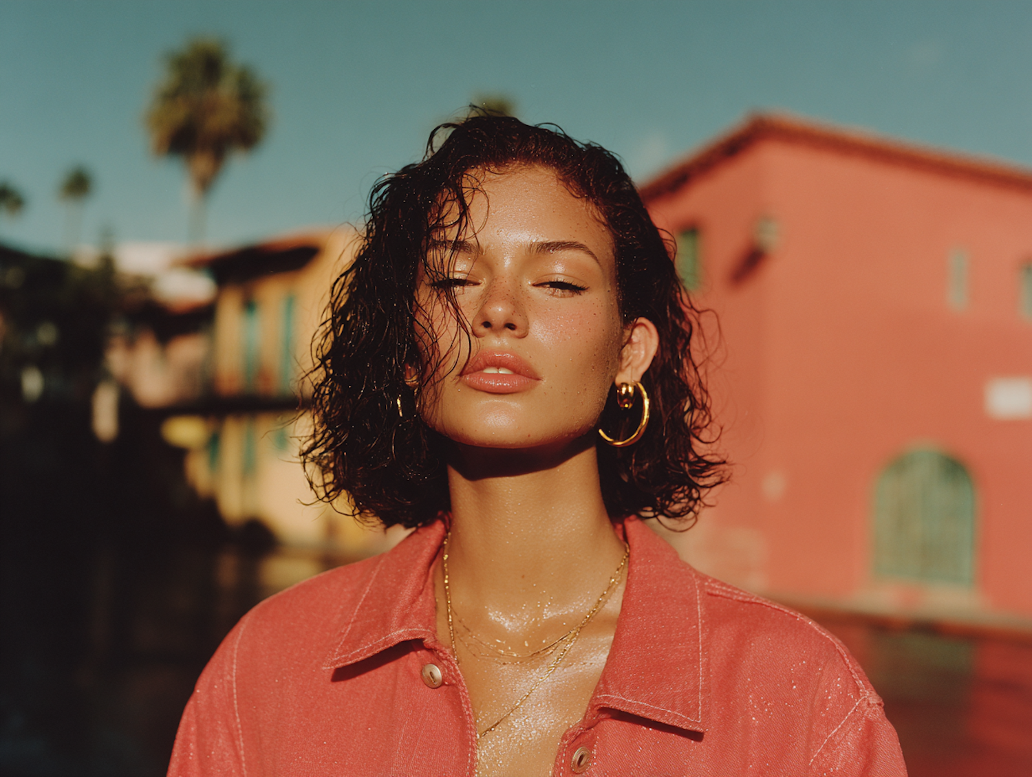 A young woman with short curly hair and gold hoop earrings stands in sunlight, wearing a coral jacket, with a warm-toned building behind her.