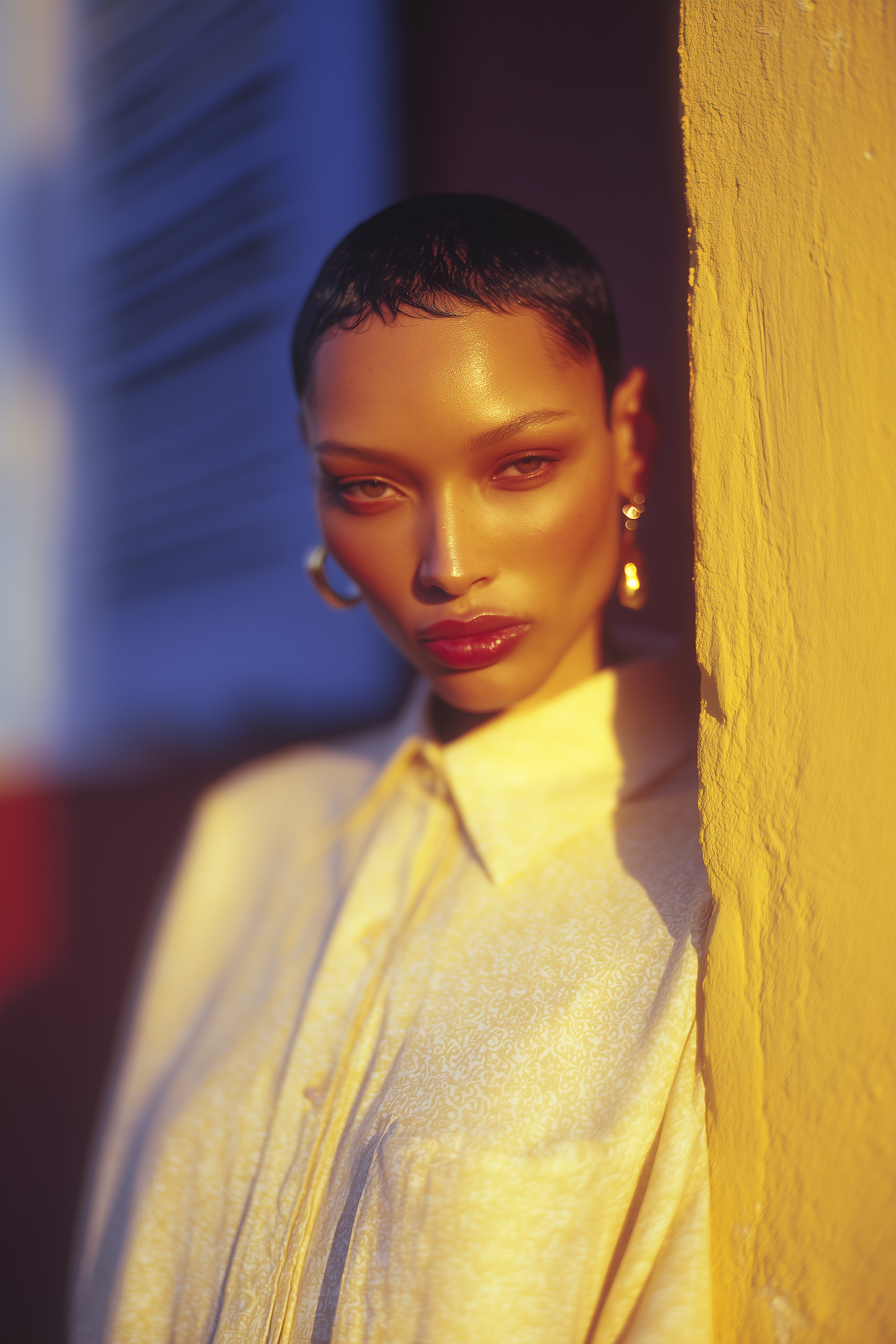 A person with short hair leans against a yellow wall, bathed in warm sunlight, wearing a light-patterned shirt, with a serene expression.