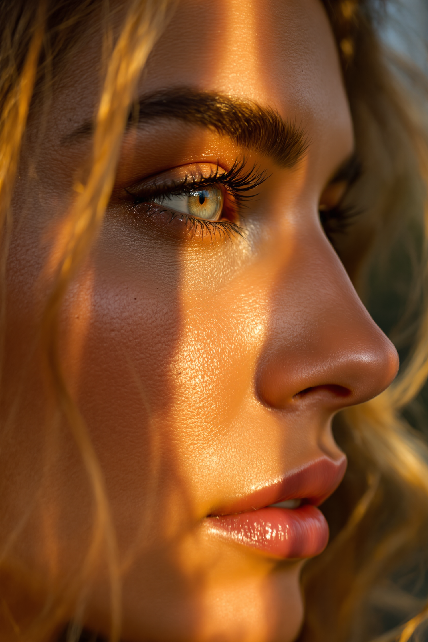 Close-up of a face in warm sunlight, highlighting a glowing complexion, striking eye, and glossy lips framed by blonde hair.