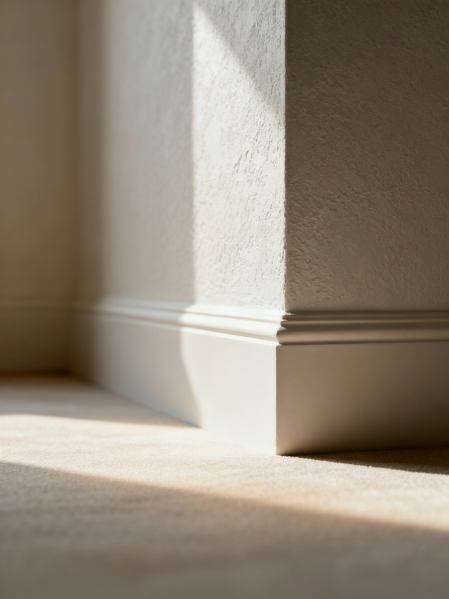 Close-up of a room corner with textured walls, white baseboard molding, and sunlight casting shadows on a beige carpeted floor.