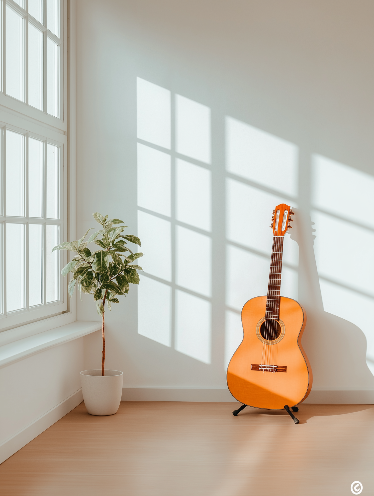 Minimalist room with a classical guitar on a stand, sunlight streaming through a window, and a potted plant on a wooden floor.