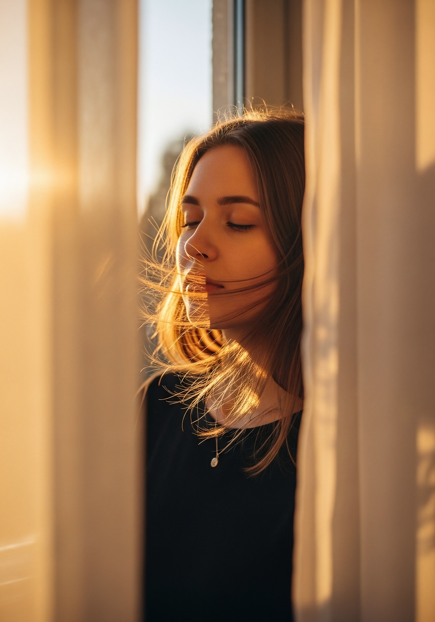 A serene portrait of a young woman bathed in warm sunlight, standing by a window with her eyes closed, exuding calm and tranquility.