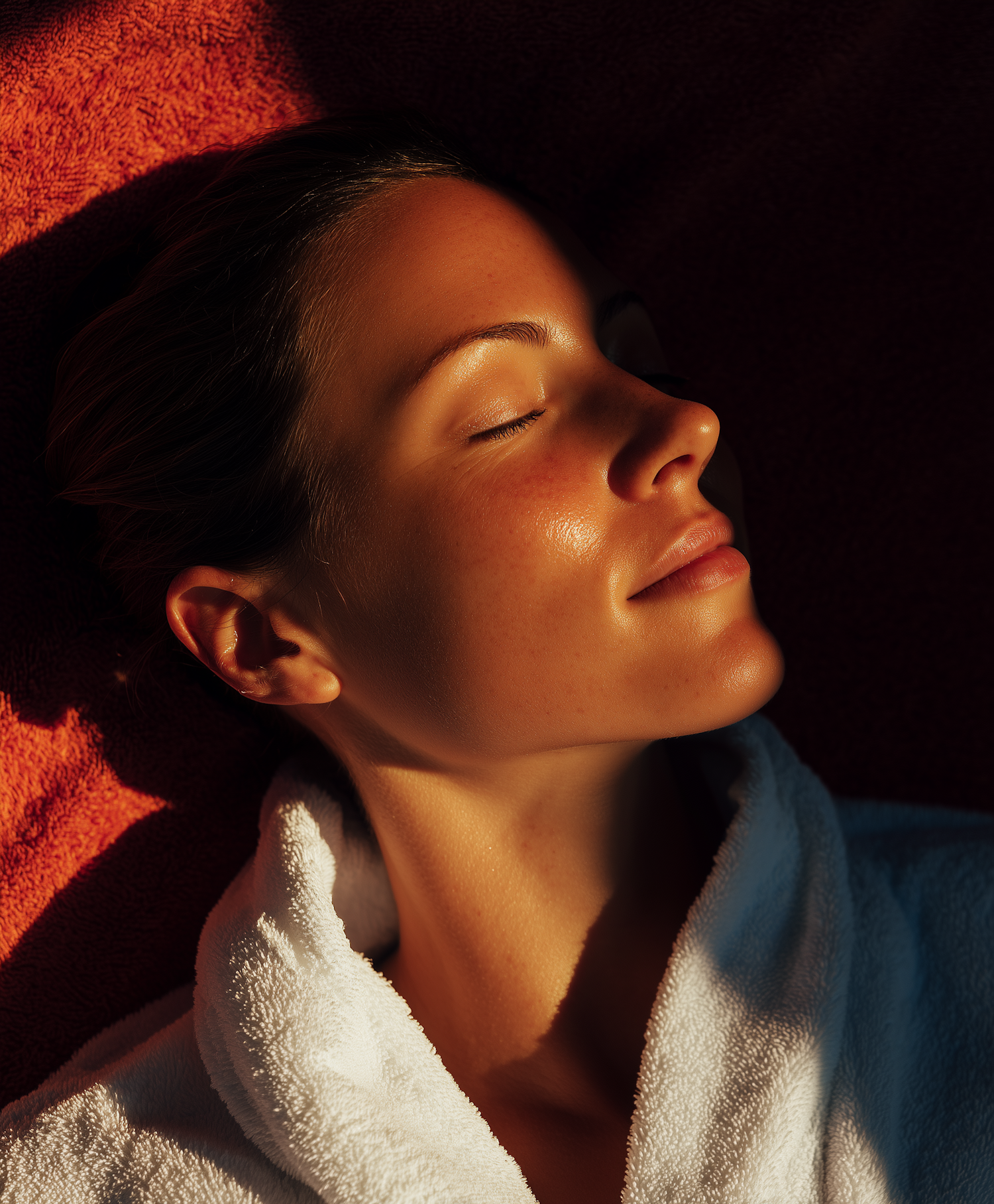A woman relaxes in warm sunlight, her face glowing with natural light, wearing a white robe against a red textured background.