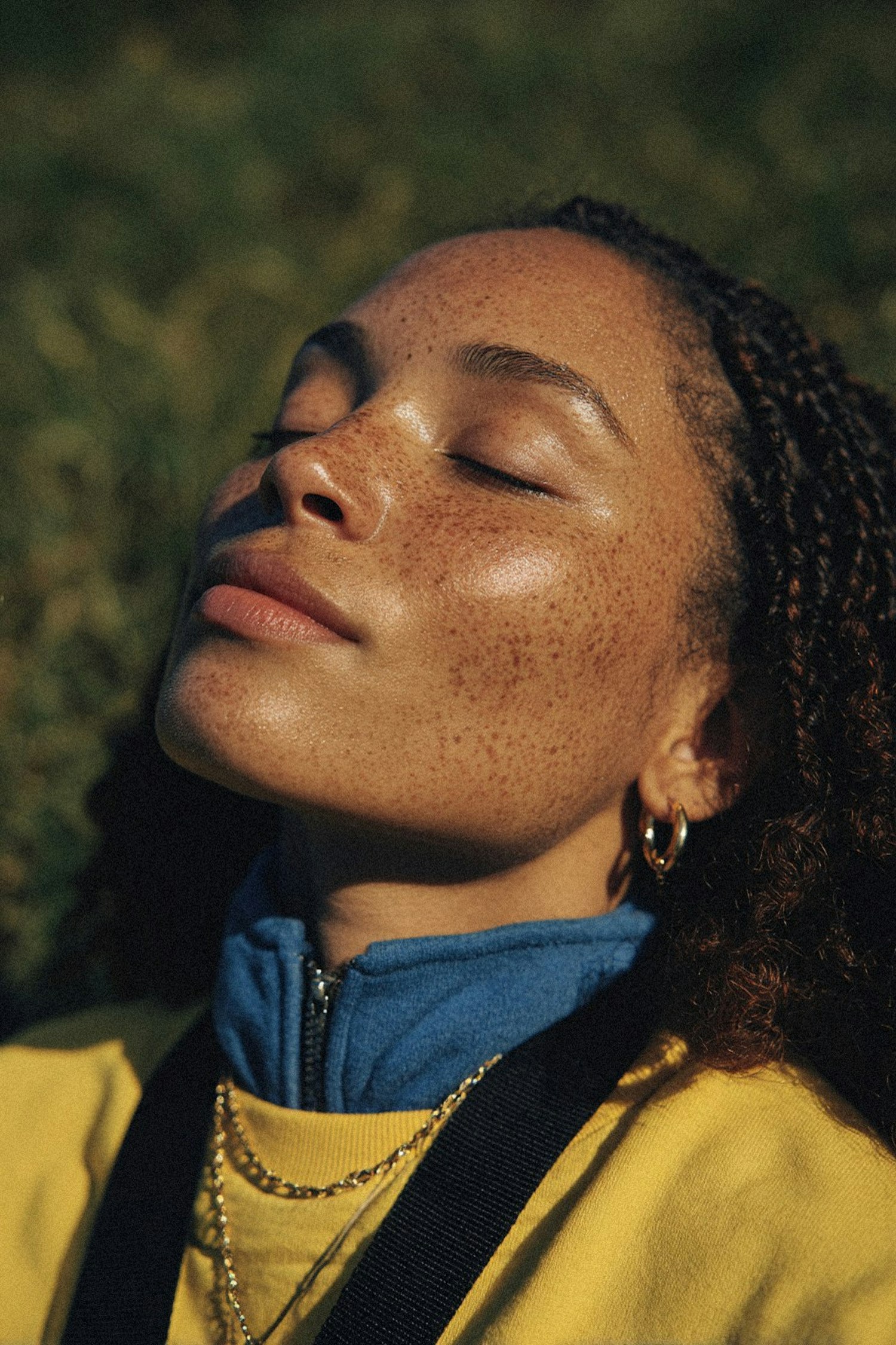 A serene close-up of a freckled individual enjoying sunlight, wearing a yellow top and gold accessories, set against a blurred green background.