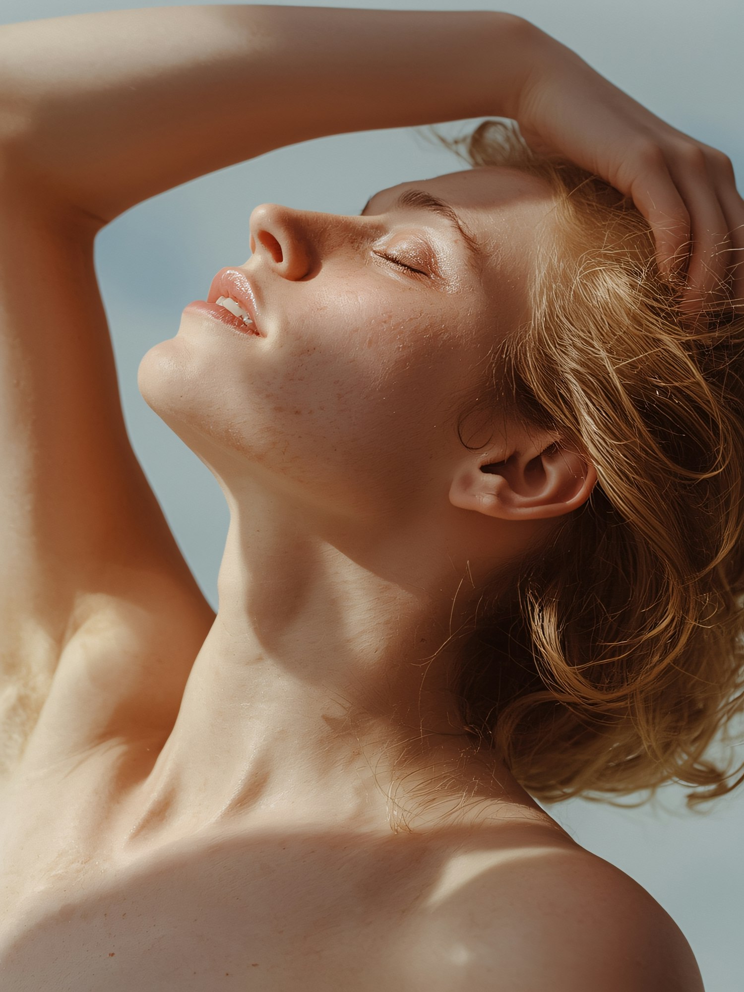 Close-up of a person with blonde hair and light skin, basking in sunlight with a serene expression, highlighting natural textures and tones.