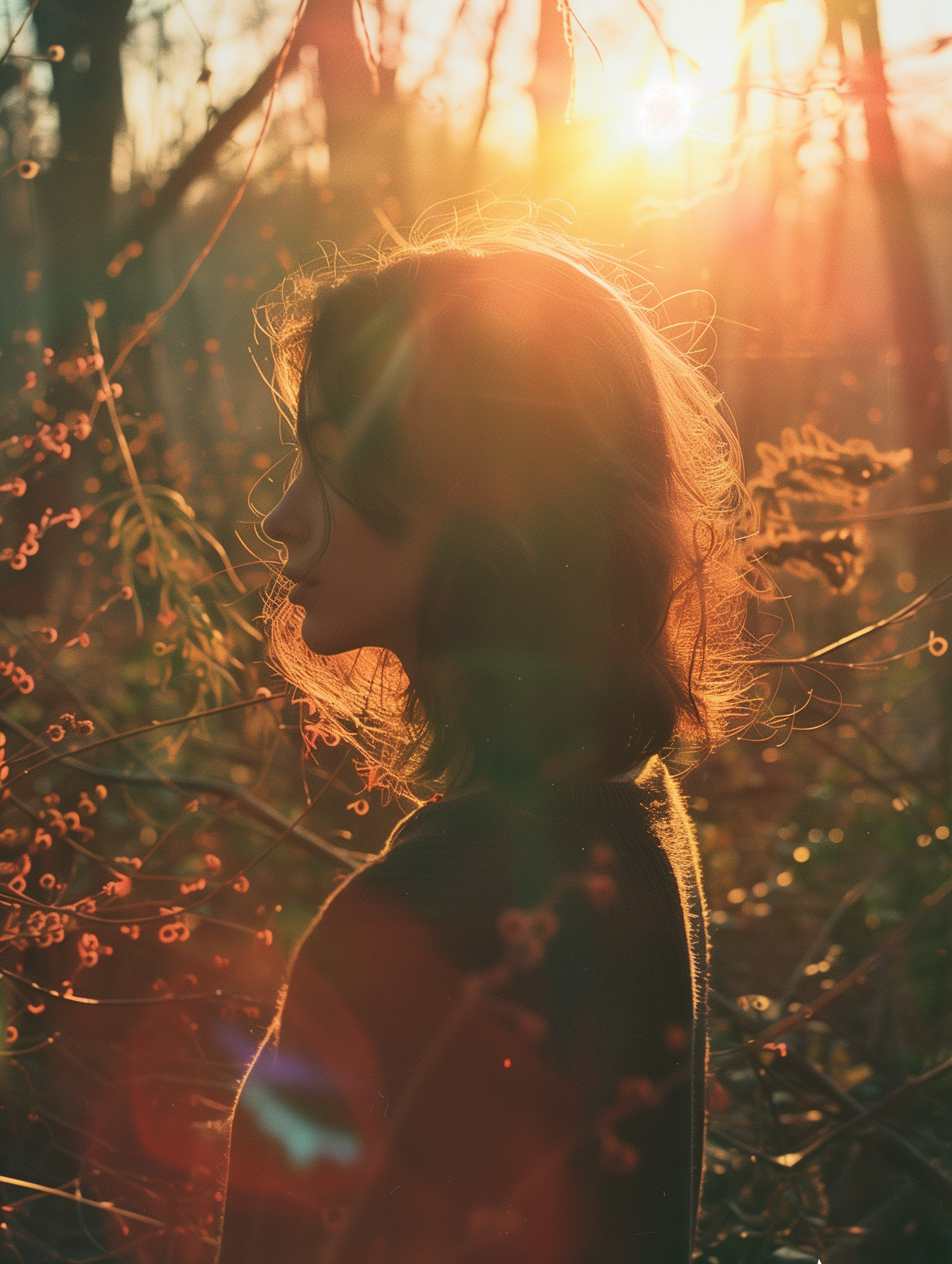 A woman with wavy brown hair in a sunlit forest during golden hour, surrounded by glowing bokeh and warm light.