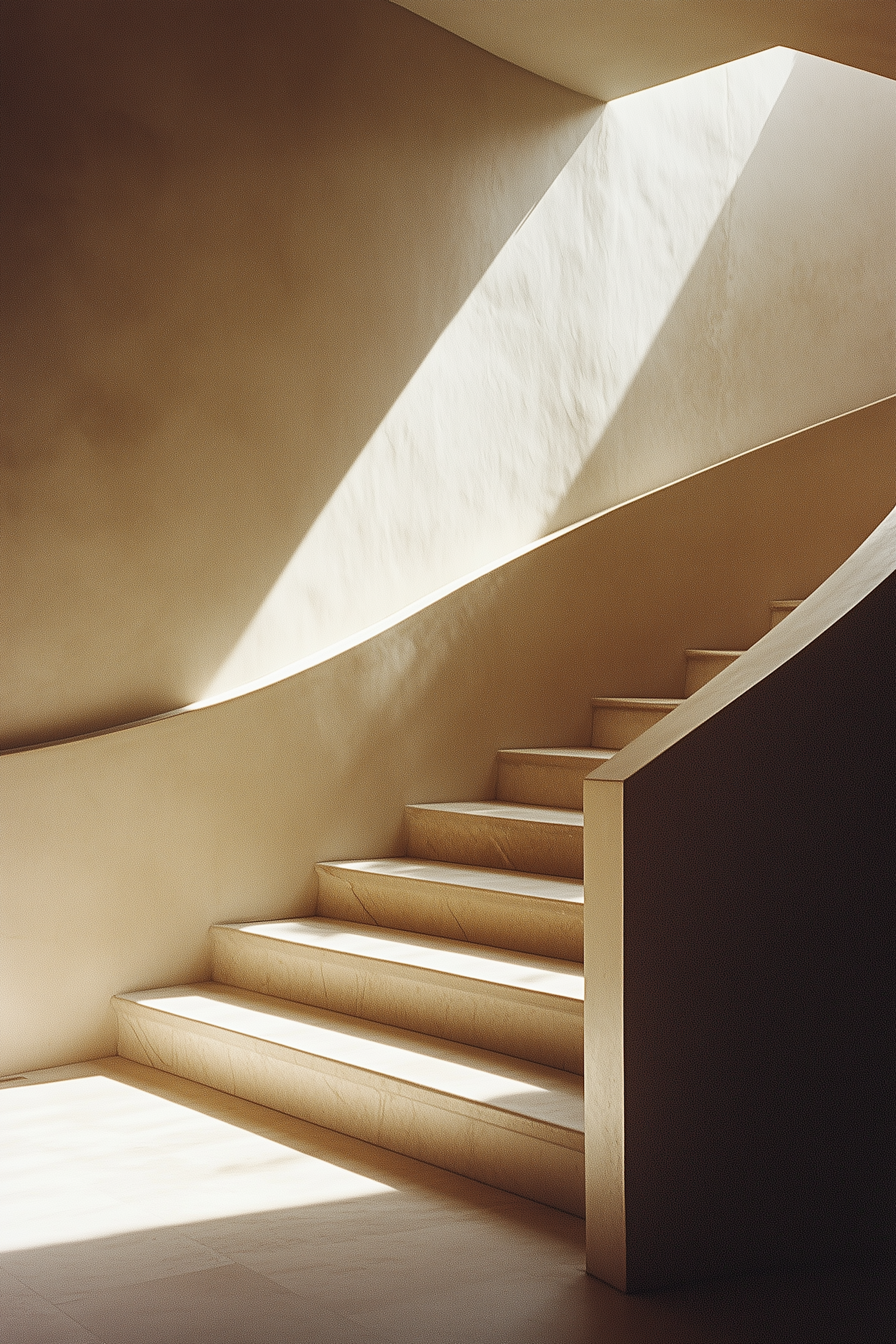 Elegant beige stone staircase with natural light casting dramatic shadows, creating a serene and minimalist architectural scene.