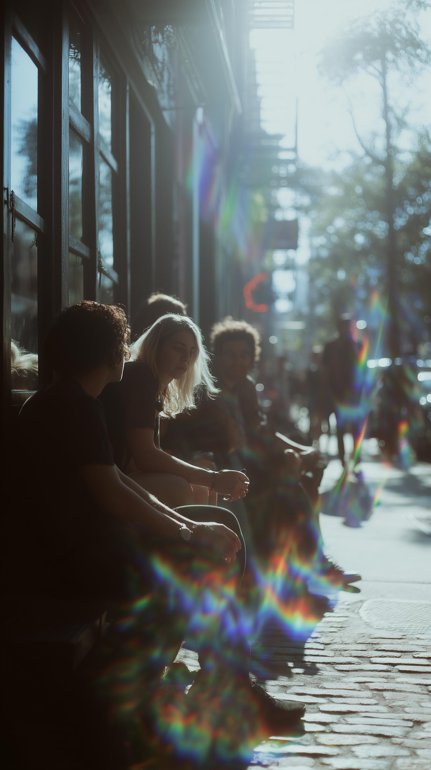 A dreamy urban scene with people sitting on a bench, sunlight streaming through trees, and vibrant rainbow lens flares.