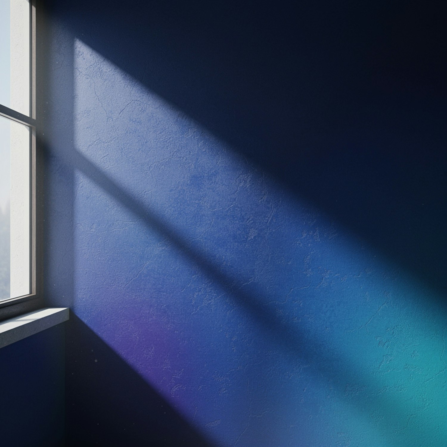Sunlight streams through a window, casting geometric shadows on a textured blue wall with a gradient of light and shadow.