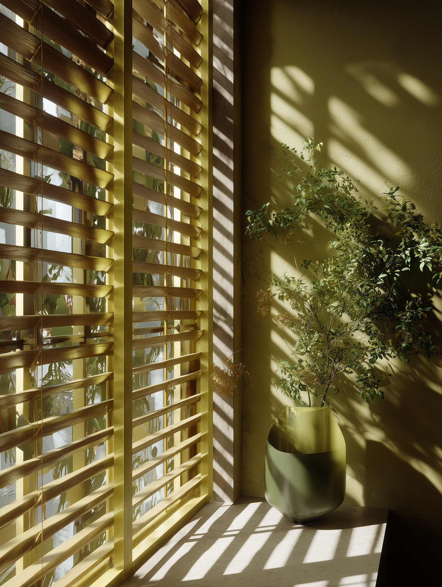 Sunlight filters through wooden blinds, casting shadows on a yellow wall. A green vase with branches adds a natural, serene touch to the scene.
