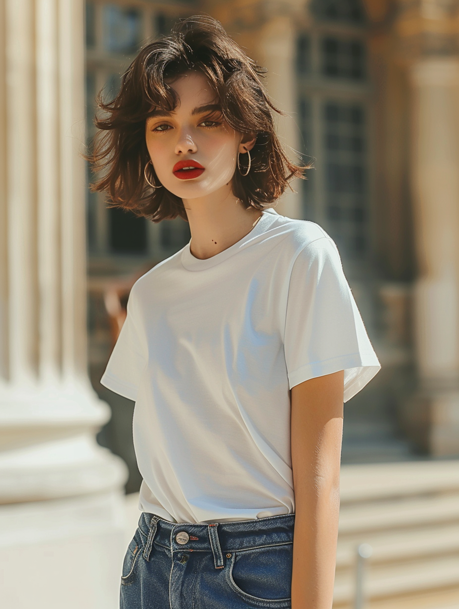 Stylish young woman with red lipstick, white t-shirt, and jeans, standing outdoors with elegant architecture in the background.