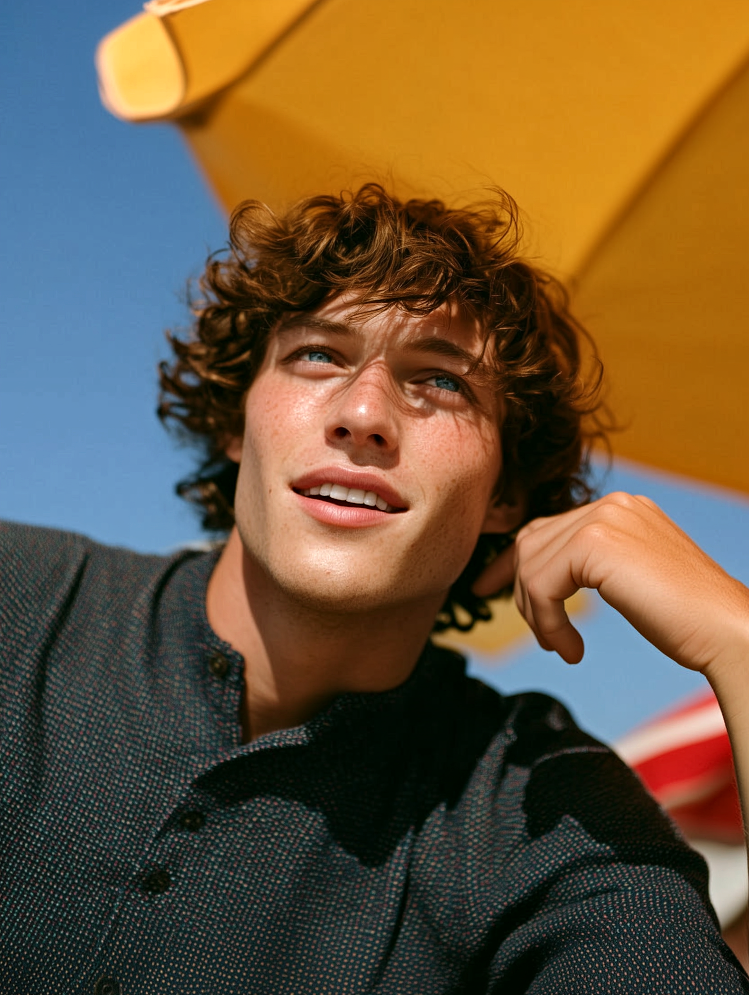A young man with curly hair and blue eyes under a yellow umbrella, enjoying a sunny day with a relaxed and thoughtful expression.