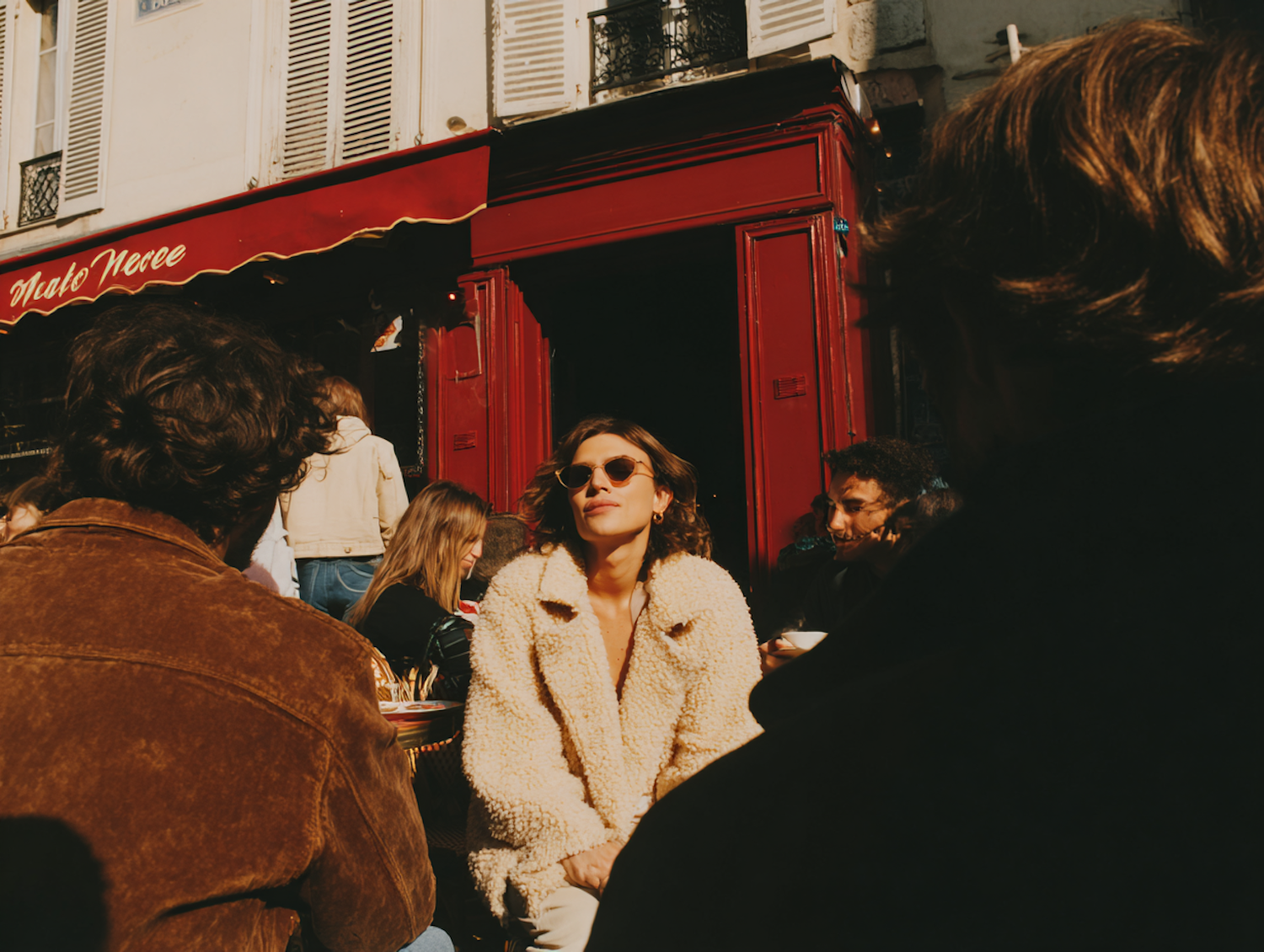 A sunny day at a café with people enjoying conversations, featuring a vibrant red storefront and a relaxed atmosphere.