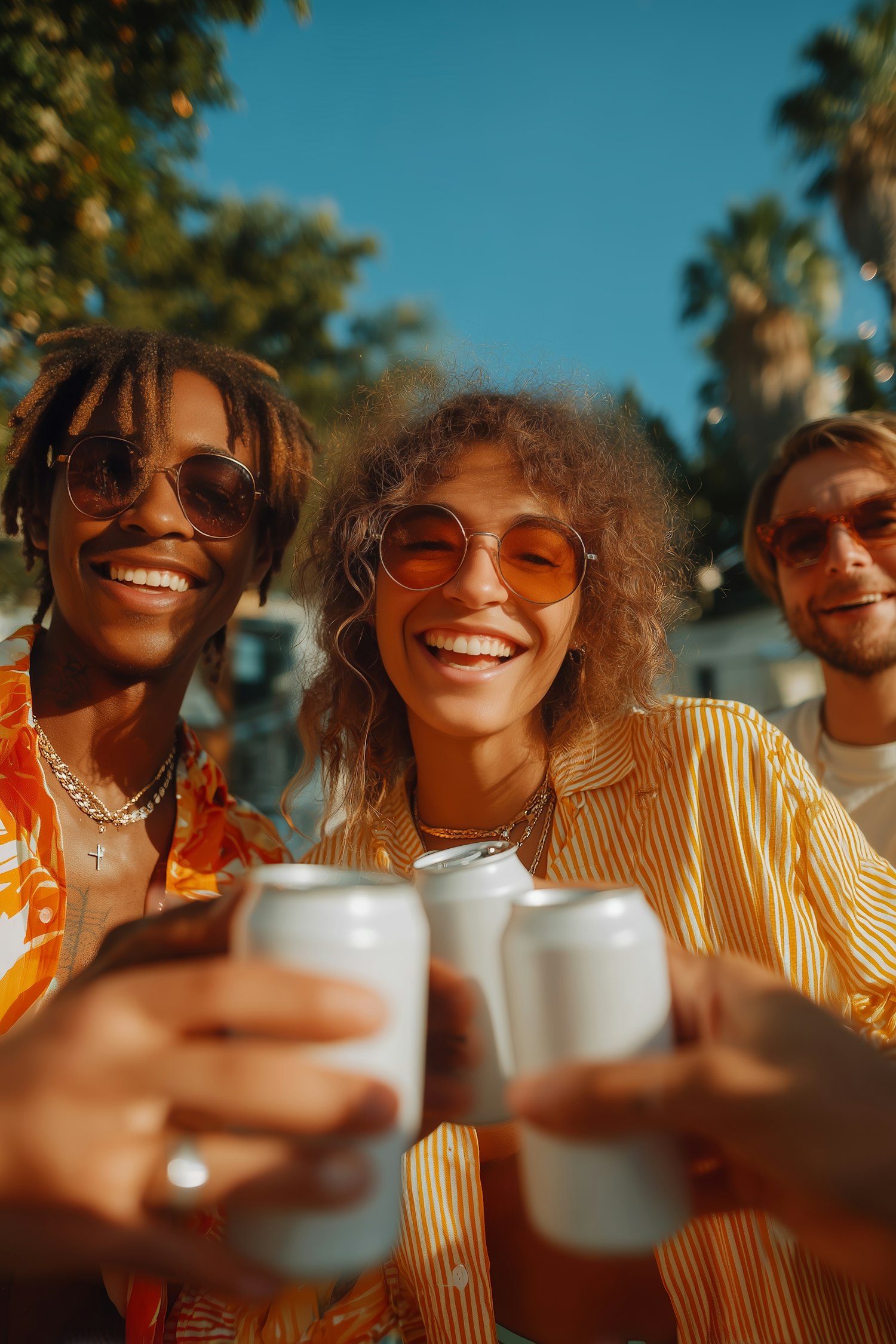Three friends enjoying a sunny day, smiling and holding drinks, with a vibrant outdoor background and a cheerful atmosphere.
