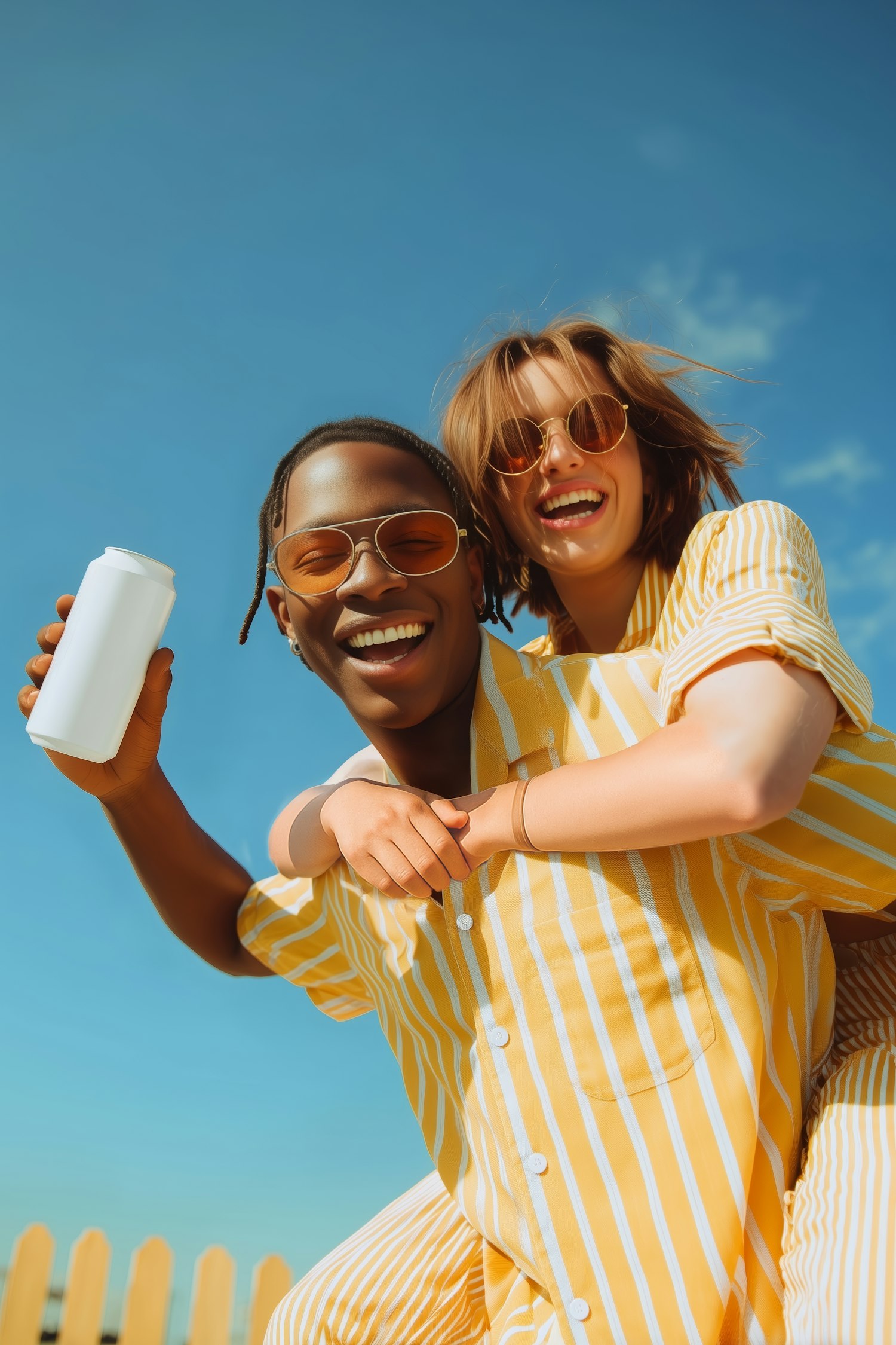Two friends in matching yellow striped shirts enjoy a sunny day, smiling and laughing against a clear blue sky.