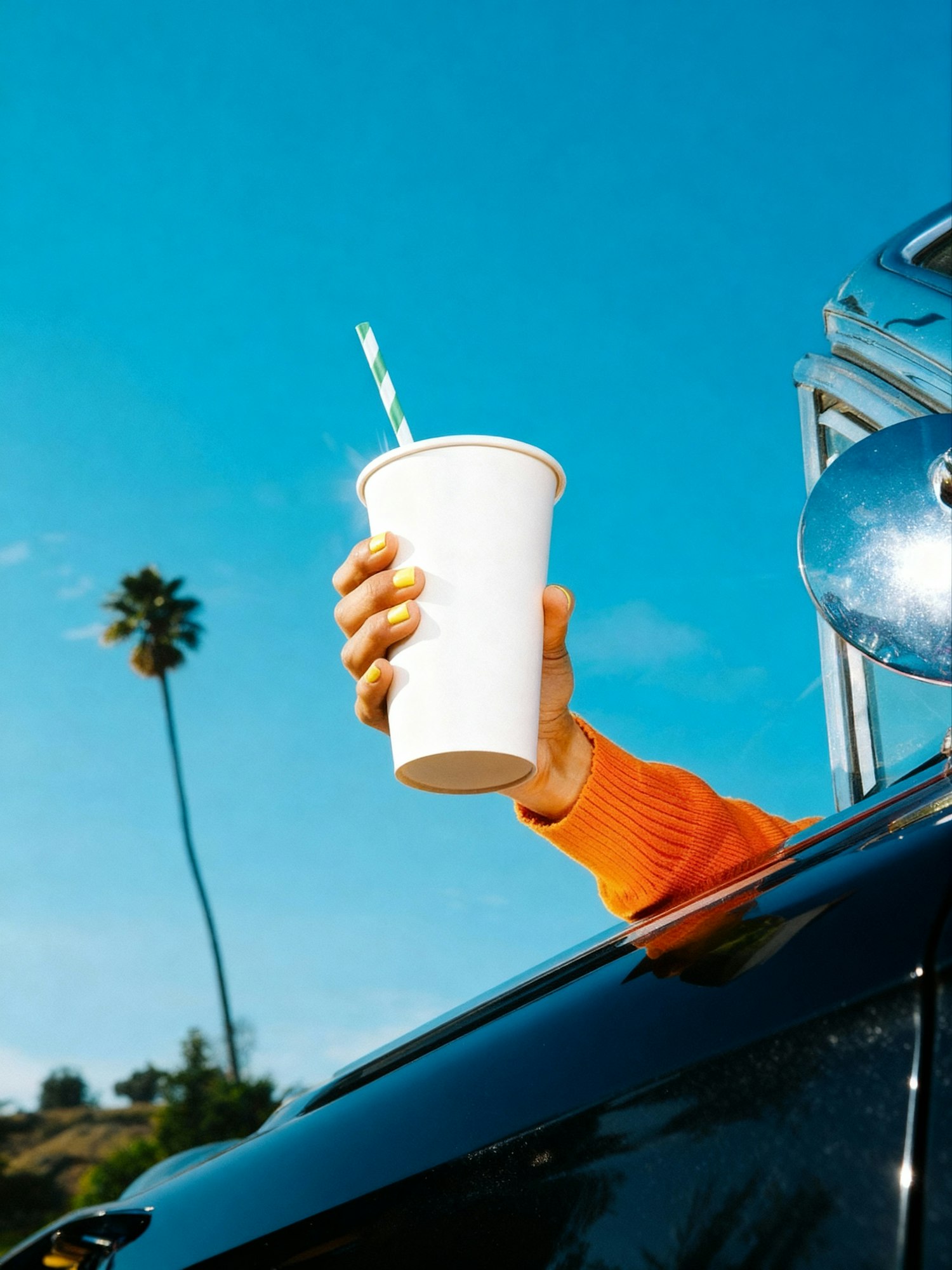 A hand in an orange sweater holds a white cup with a striped straw out of a car window against a sunny blue sky with a palm tree.