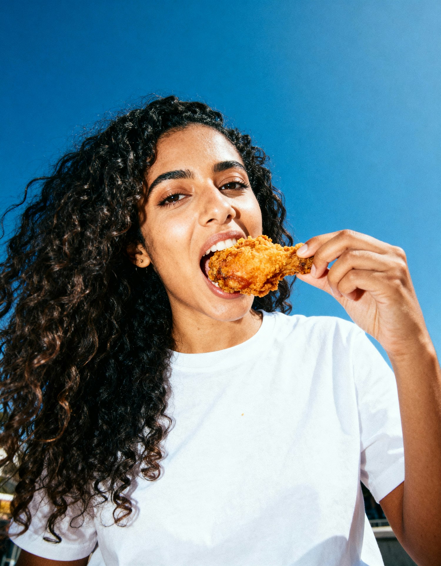 A woman with curly hair enjoys fried chicken under a bright blue sky, wearing a white t-shirt, creating a vibrant and cheerful scene.