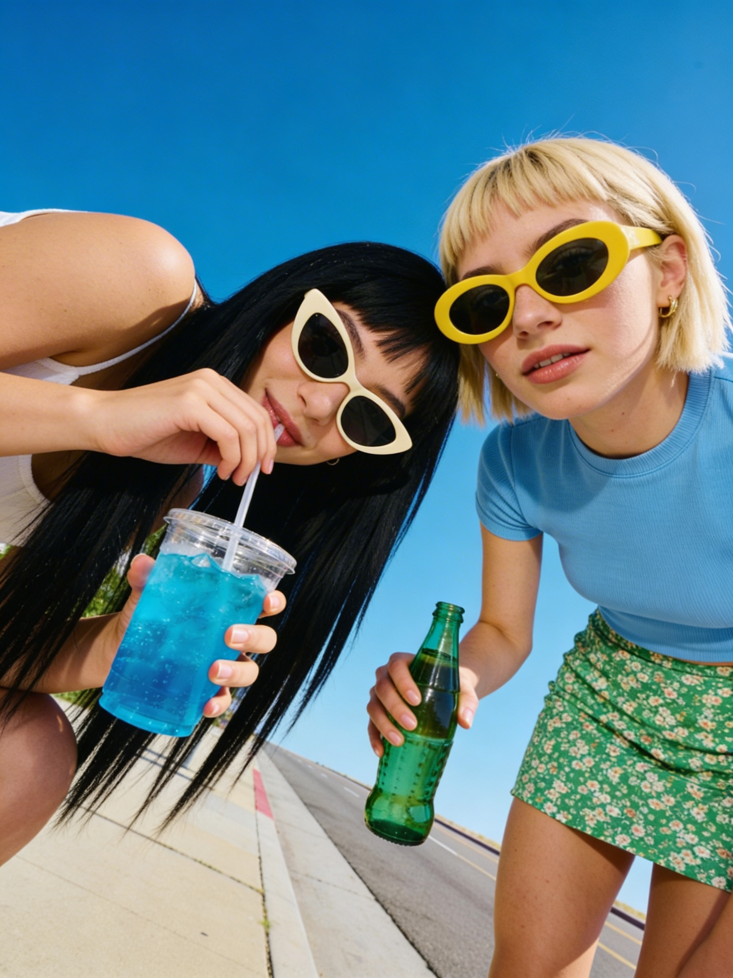 Two stylish women enjoy drinks under a bright blue sky, showcasing playful sunglasses and vibrant summer vibes.