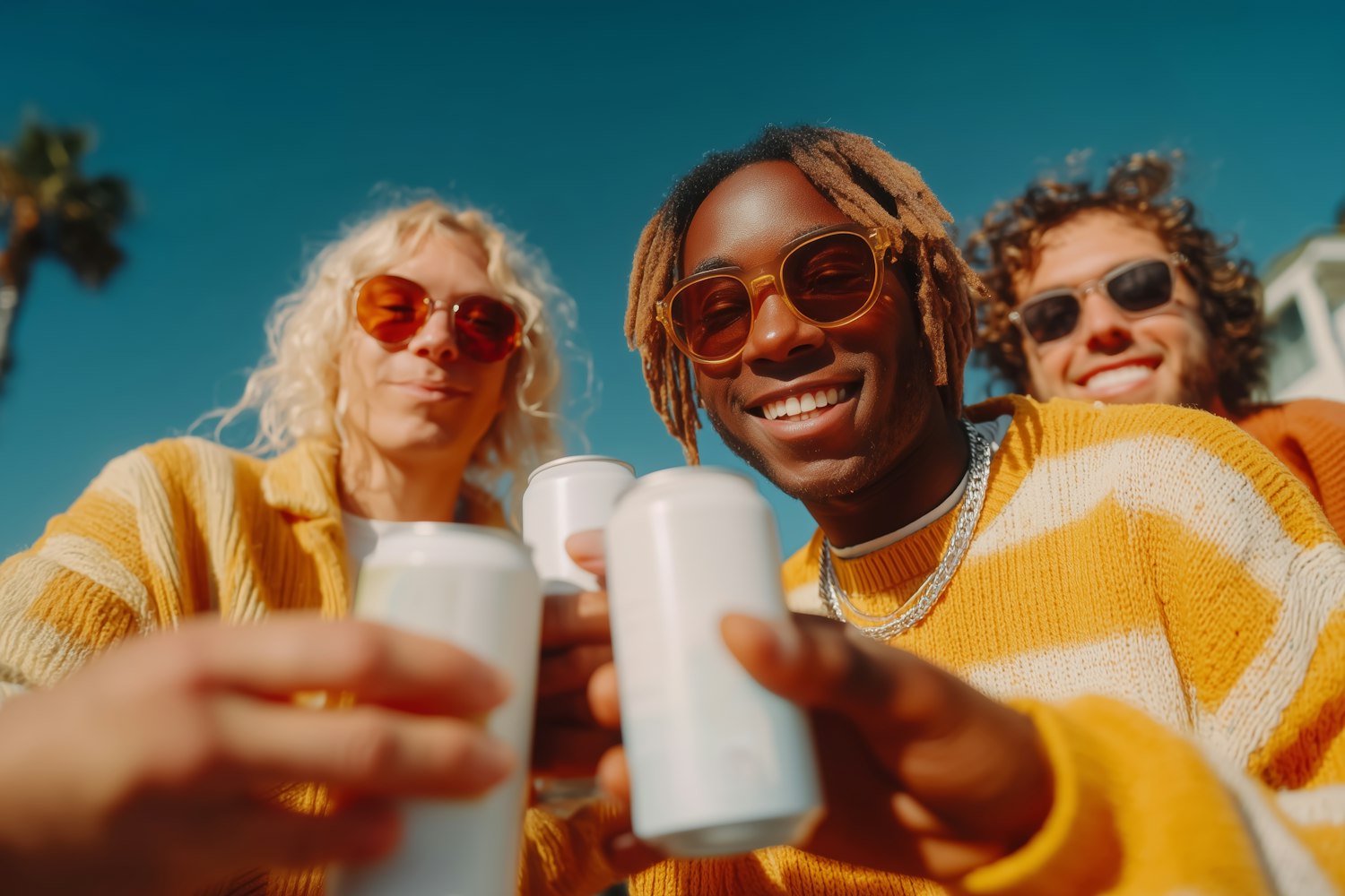Three friends in bright sweaters and sunglasses enjoy a sunny day, holding cans and smiling against a clear blue sky.