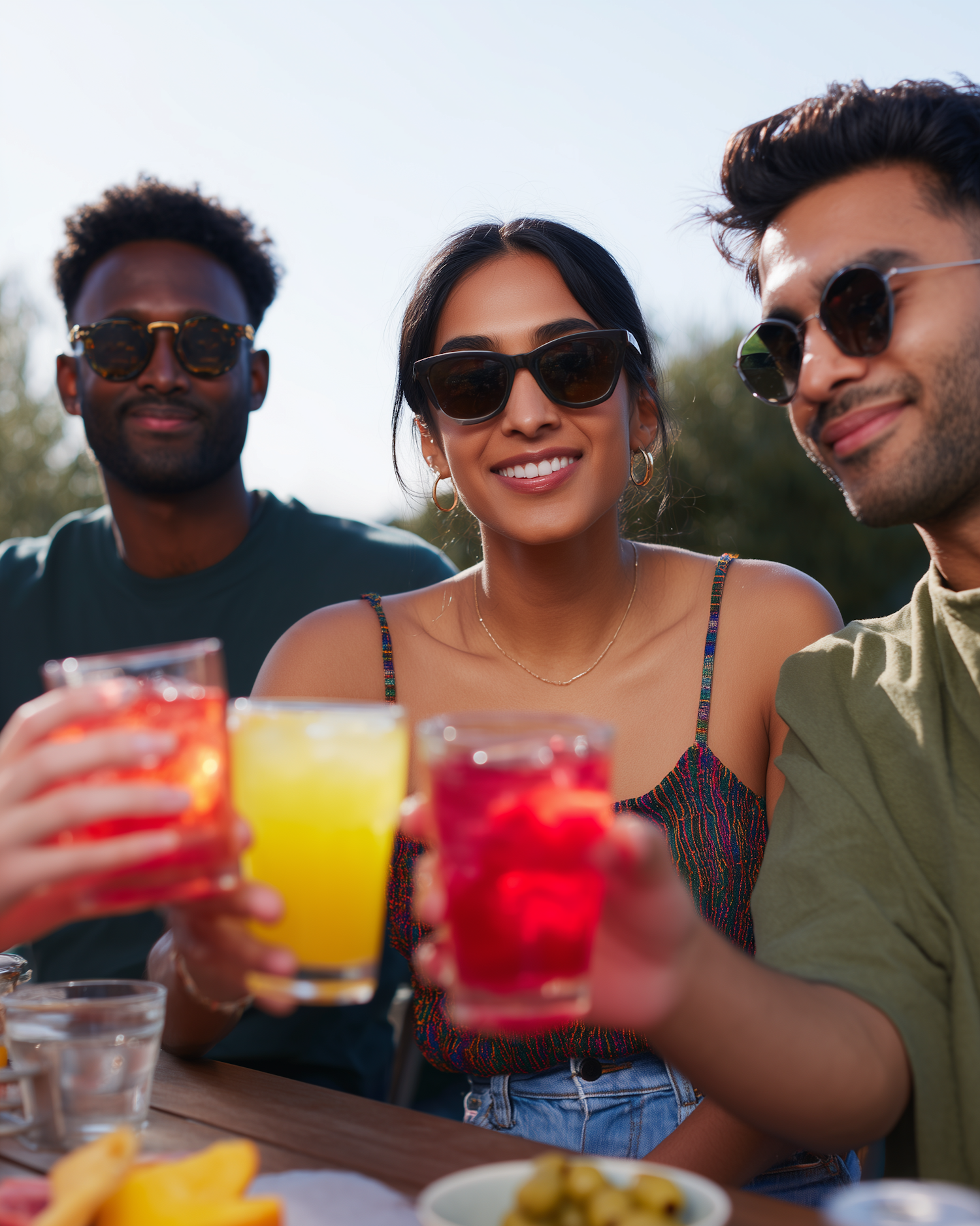 Three friends enjoying colorful drinks outdoors on a sunny day, smiling and wearing sunglasses, with snacks on the table.