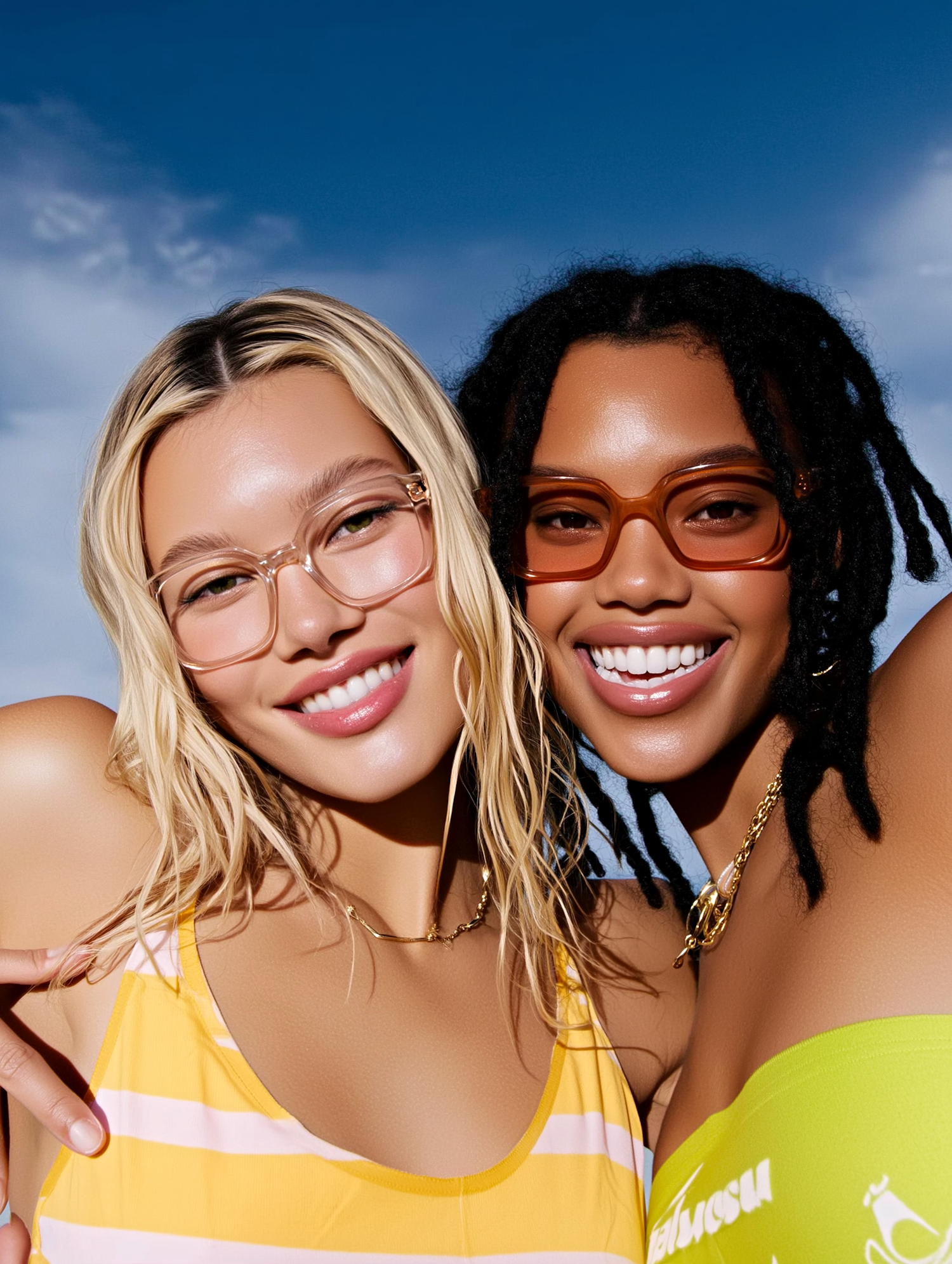 Two friends smiling outdoors, wearing stylish glasses and colorful outfits, enjoying a sunny day with a clear blue sky.