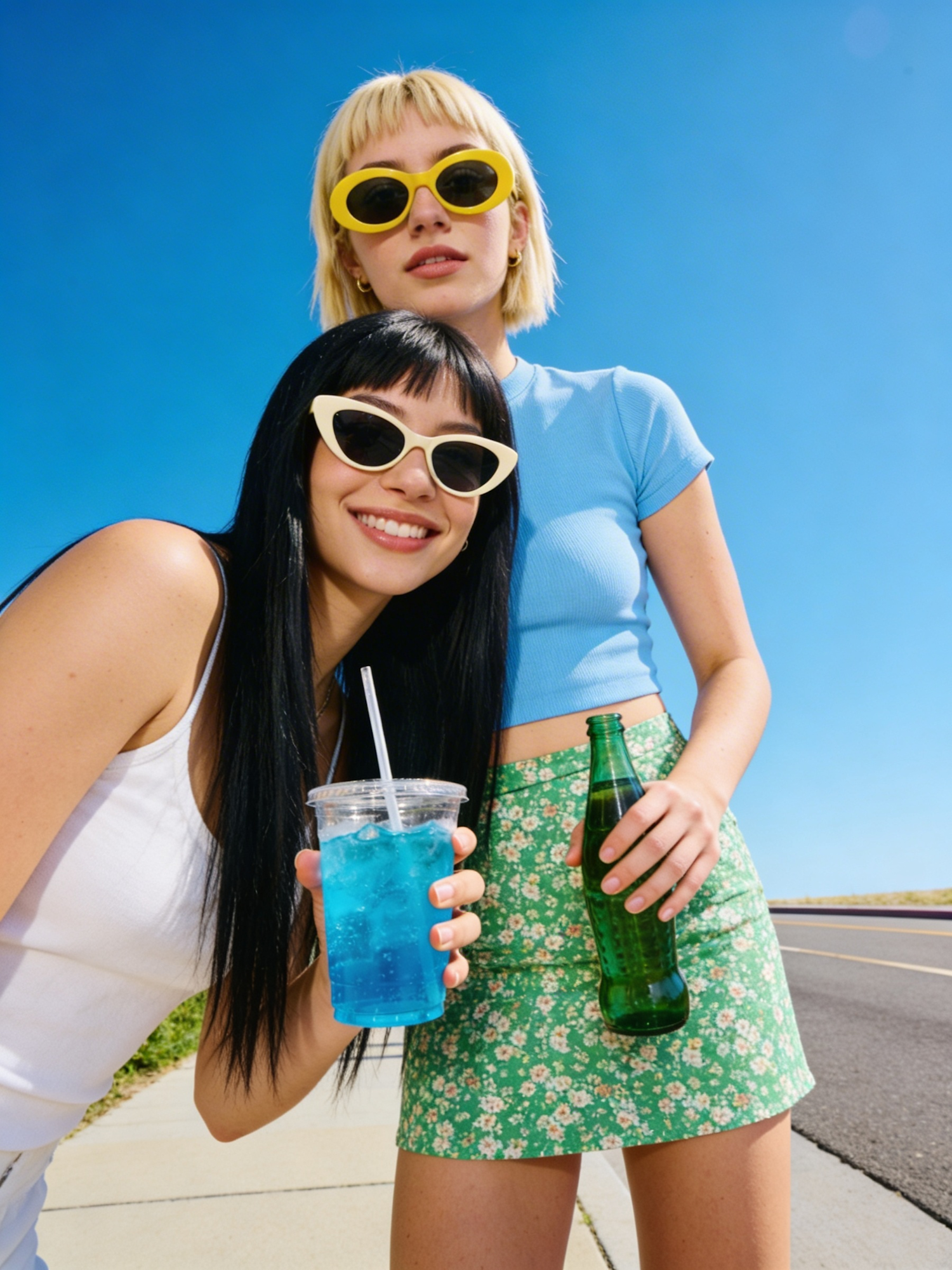 Two stylish women enjoying a sunny day, holding drinks and wearing colorful outfits and sunglasses against a clear blue sky.