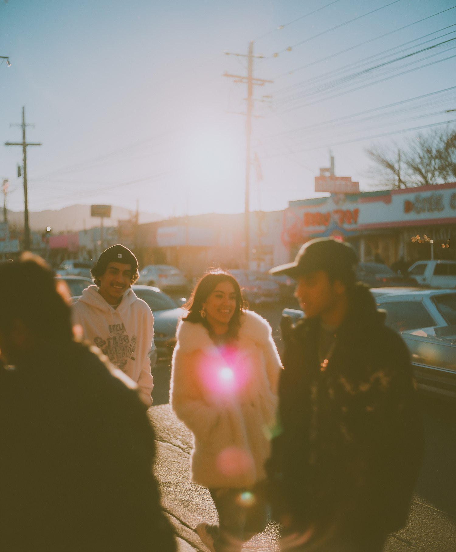 A group of friends walking in the sunlight, with warm tones and a vibrant atmosphere, showcasing a casual and joyful moment.