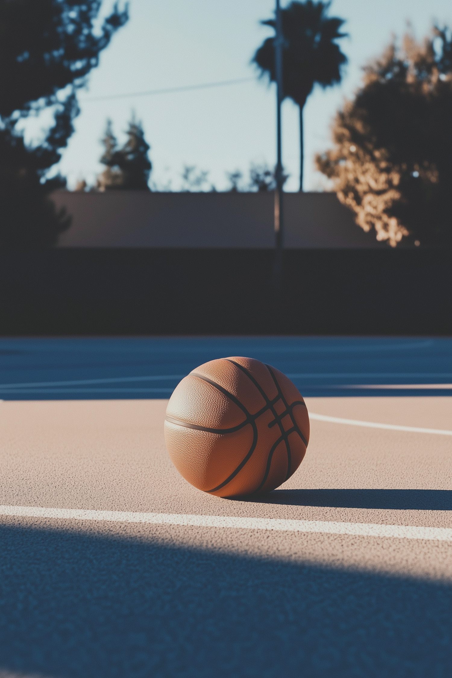 A basketball on an outdoor court at sunset, with trees silhouetted against a clear sky, creating a serene and peaceful atmosphere.