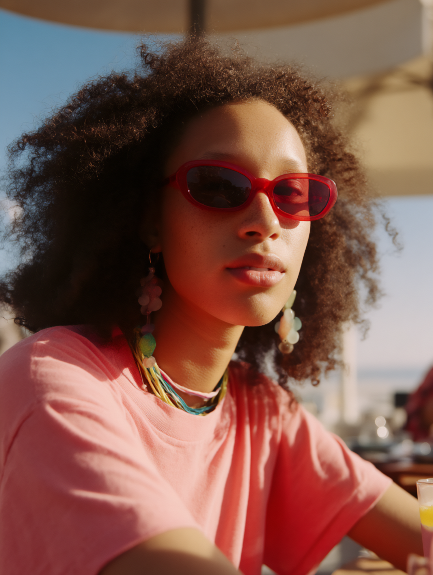 Stylish woman in red sunglasses and pink t-shirt enjoying a sunny day outdoors, accessorized with colorful jewelry.