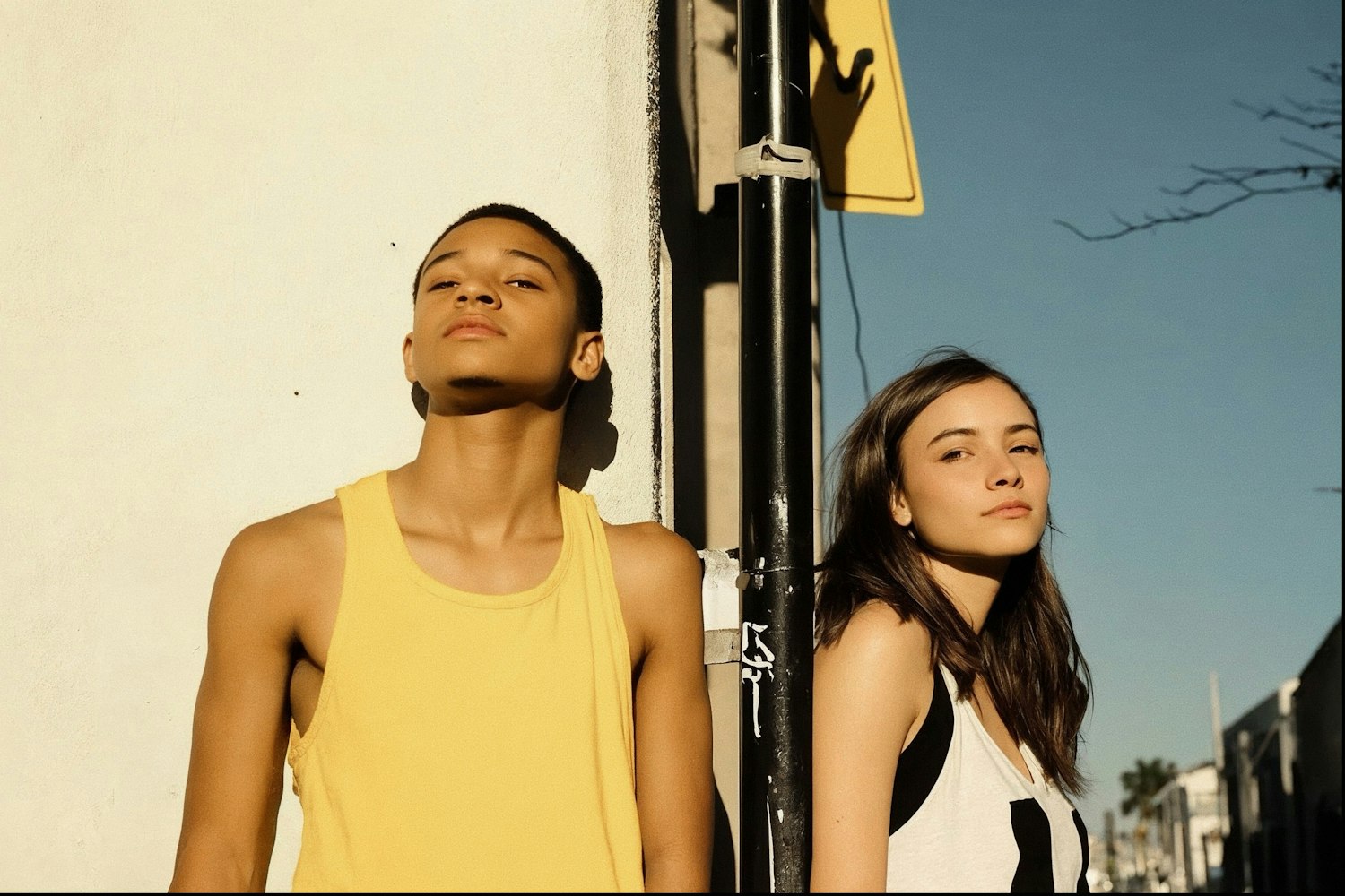 Two young individuals stand outdoors in bright sunlight, leaning against a wall and pole, wearing casual tank tops under a clear blue sky.