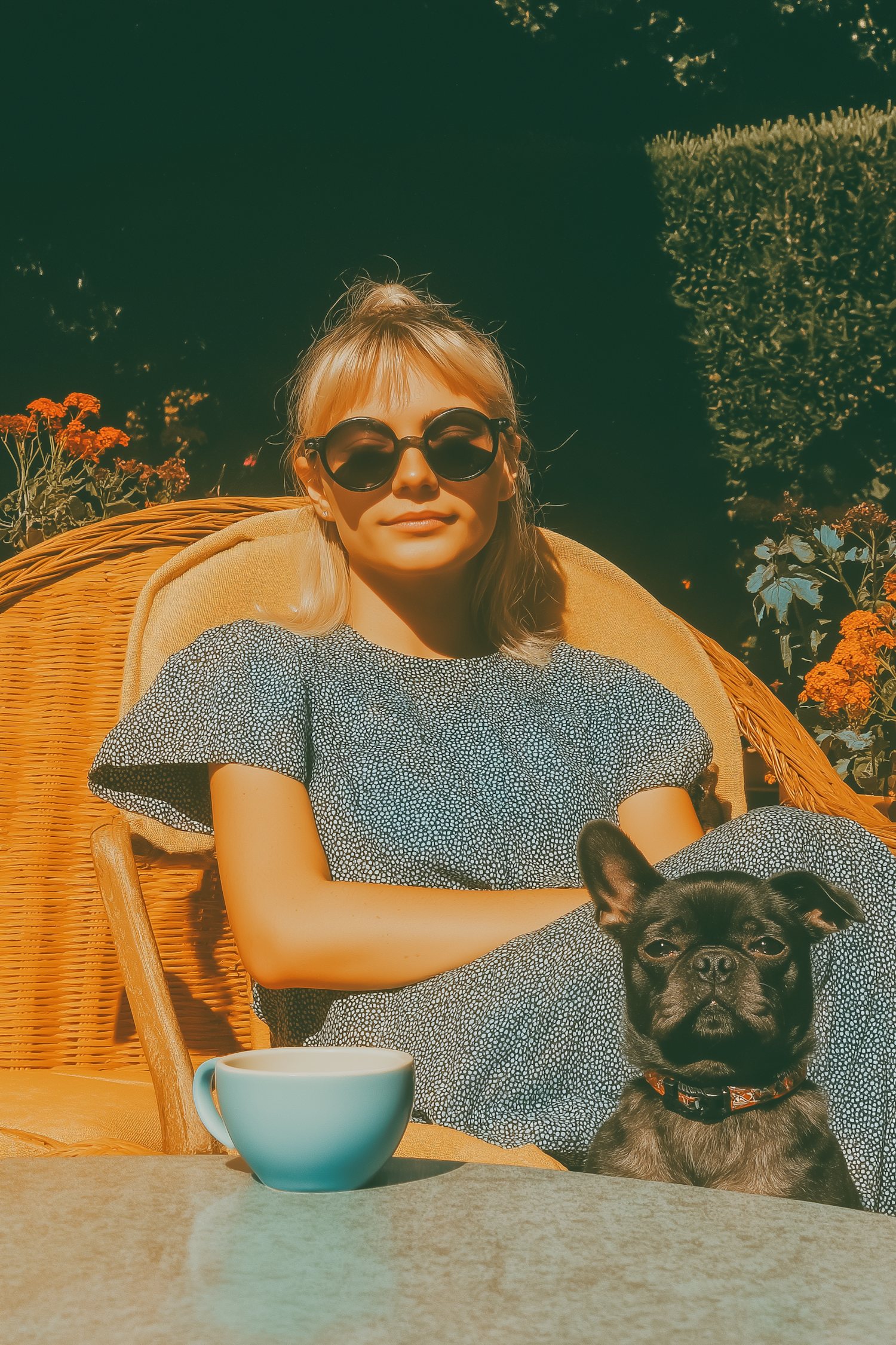 A woman in sunglasses with her black dog enjoys a sunny day outdoors, surrounded by flowers and greenery, with a coffee cup on the table.