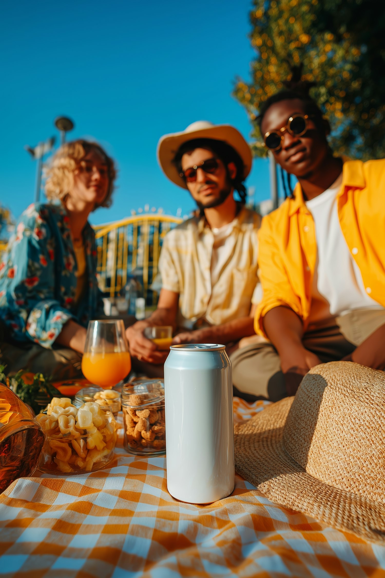 A vibrant picnic scene with friends enjoying snacks and drinks under a sunny blue sky, featuring colorful outfits and a relaxed atmosphere.