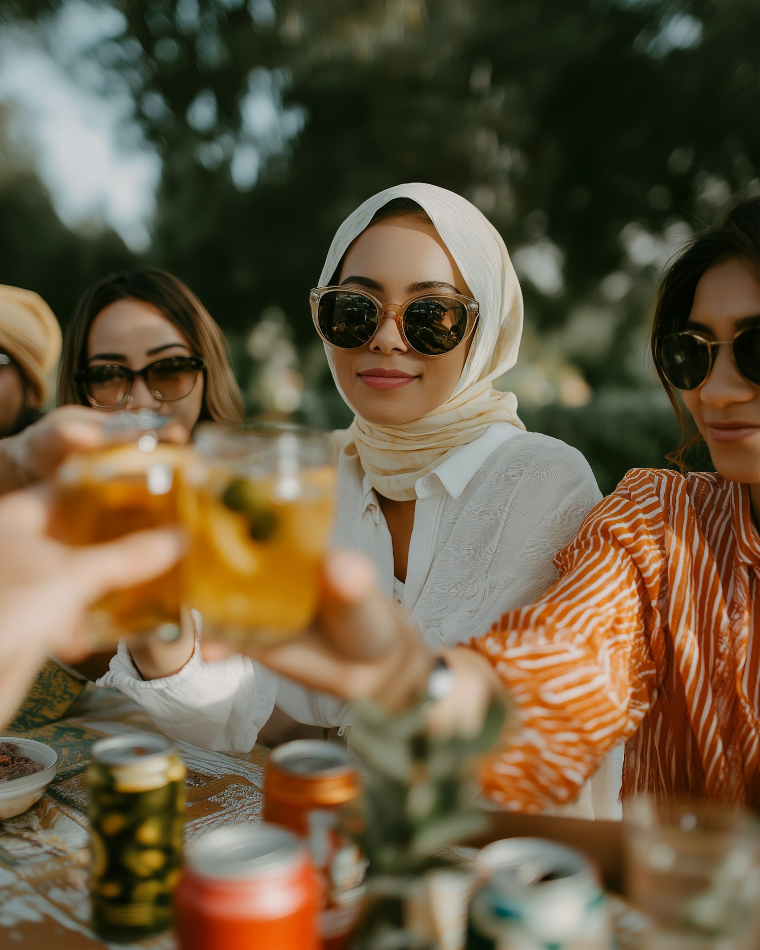 A group of friends toasting drinks at an outdoor picnic, enjoying a sunny day with snacks and beverages on a vibrant table.