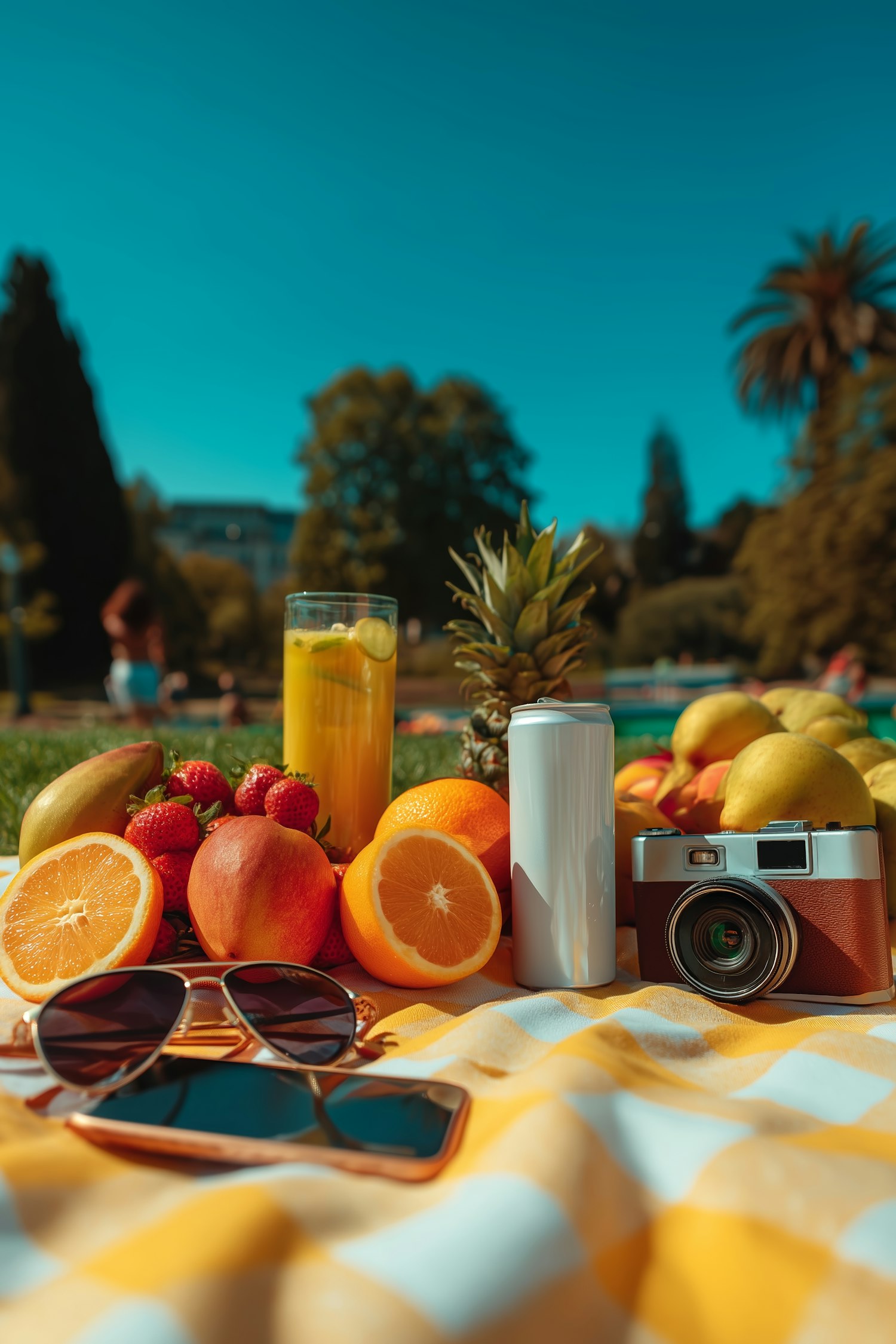 A colorful picnic setup with fruits, a drink, and accessories on a sunny day in a park, perfect for a relaxing outdoor experience.