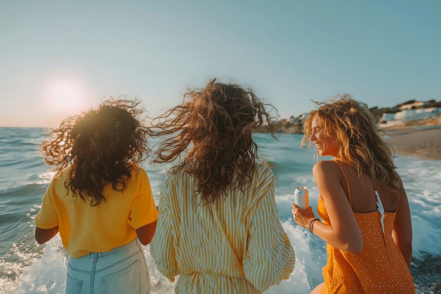 Three women in colorful summer outfits enjoy a sunny day by the sea, with their hair flowing in the breeze and smiles on their faces.