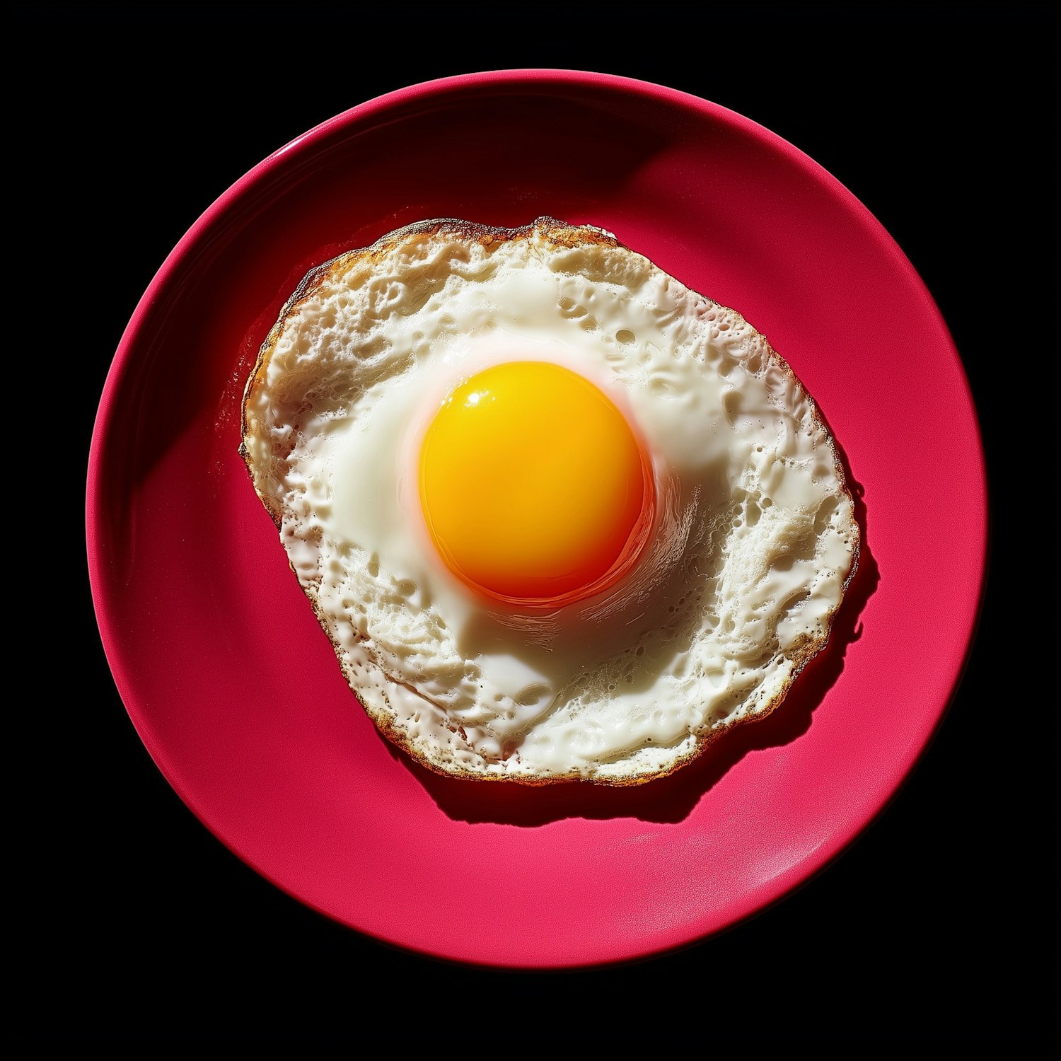 A vibrant sunny-side-up egg on a red plate against a black background, showcasing bold colors and minimalistic food styling.