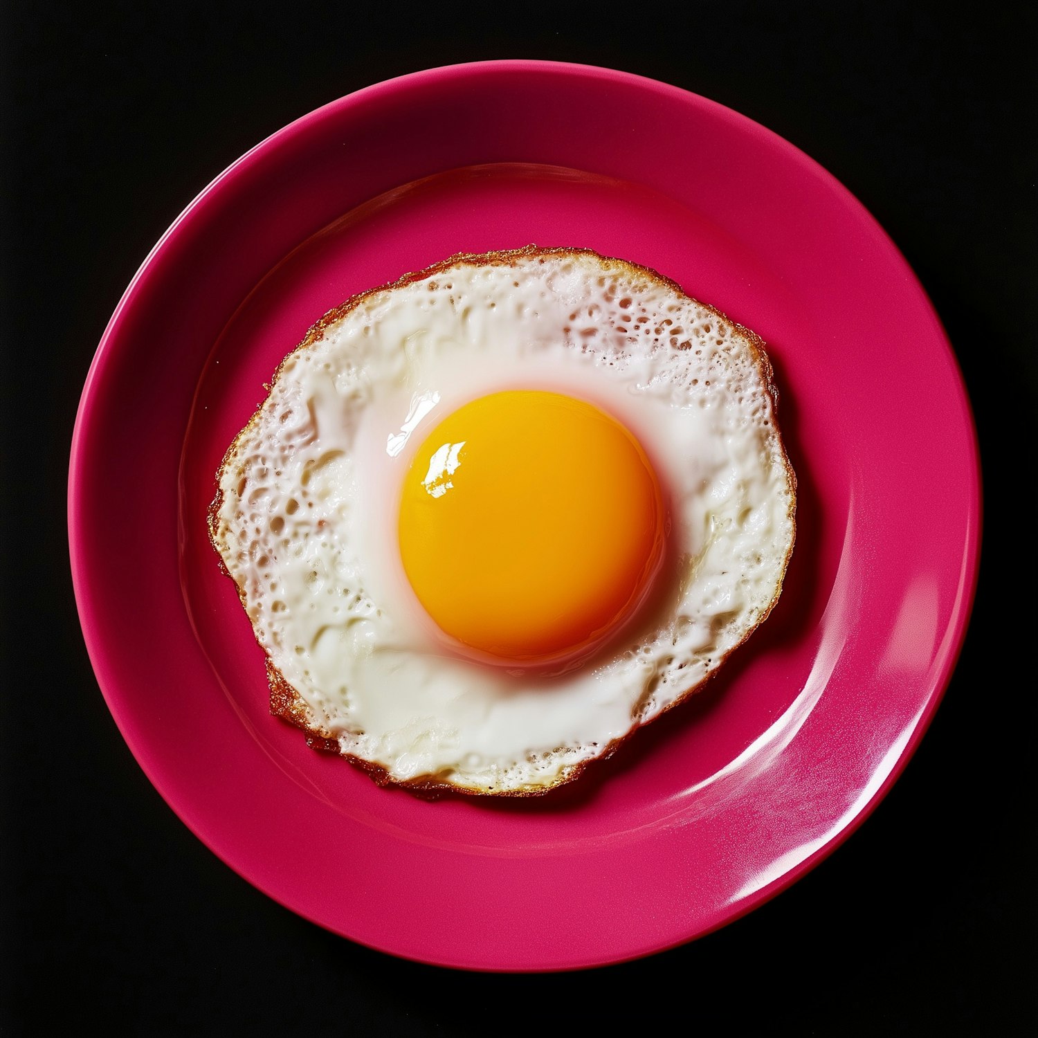 A sunny-side-up egg with a golden yolk on a bright pink plate, set against a black background for a bold, modern look.