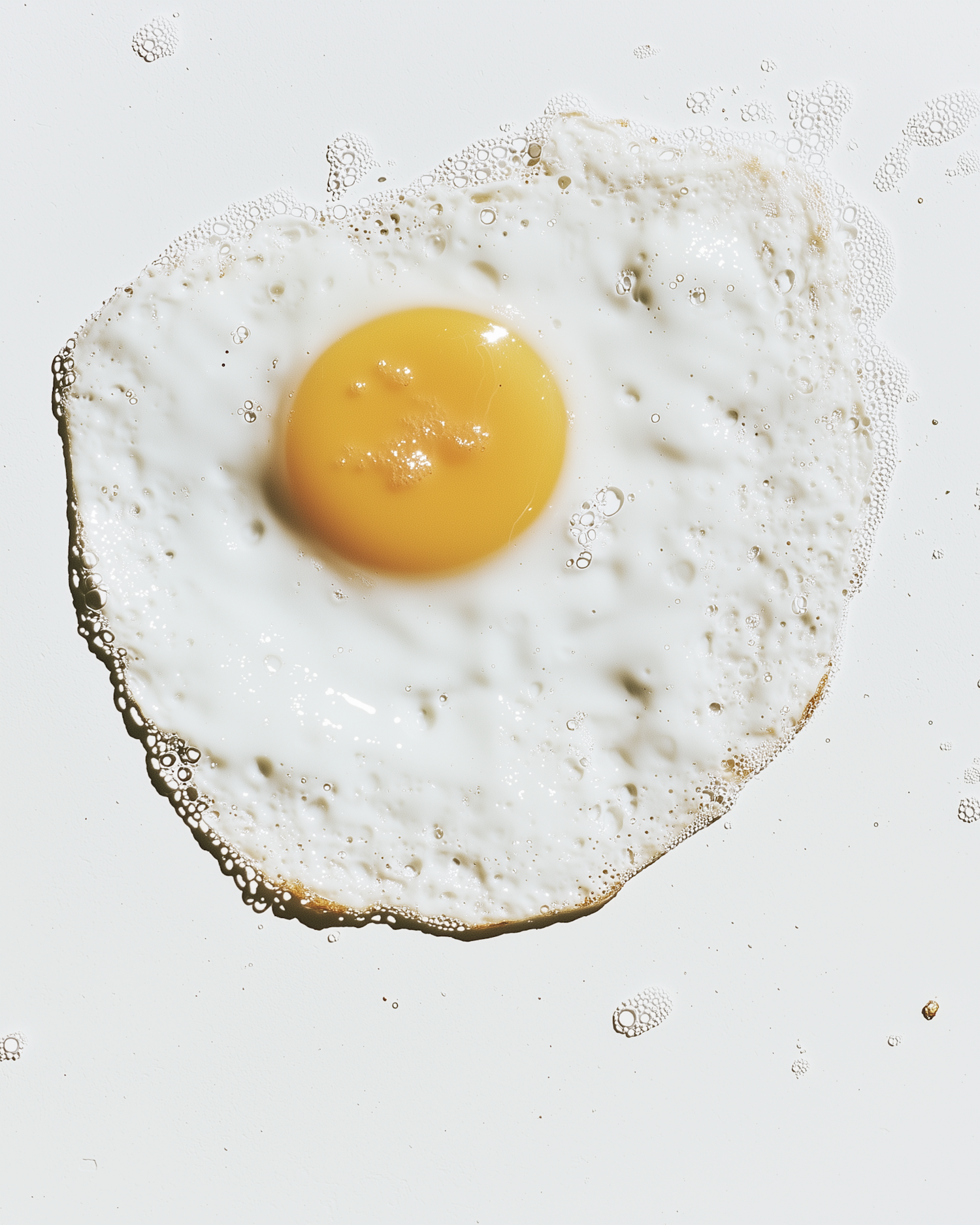 Close-up of a sunny-side-up egg with a vibrant yolk and crispy edges on a clean white background. Perfect for food photography lovers.