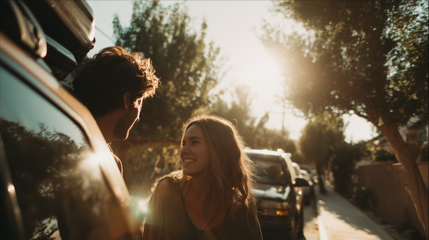 A candid moment of two people smiling near a car, with warm sunlight and a tree-lined street in the background.