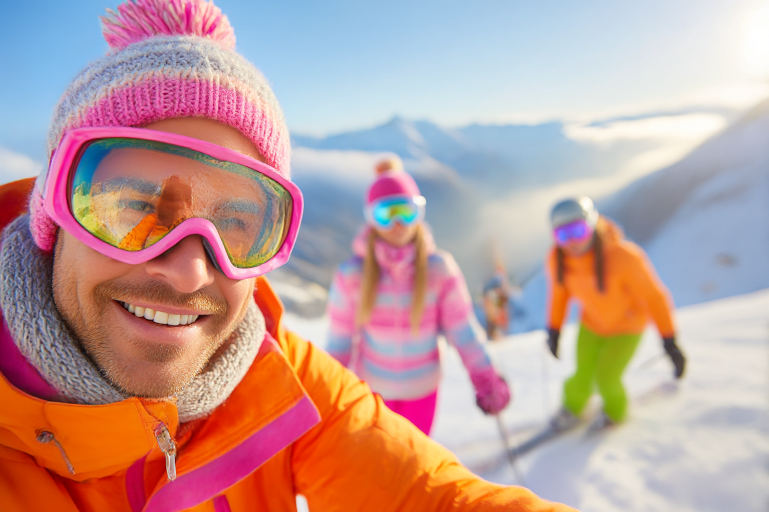 A cheerful group skiing on a sunny mountain slope, dressed in vibrant winter gear with a stunning snowy mountain backdrop.