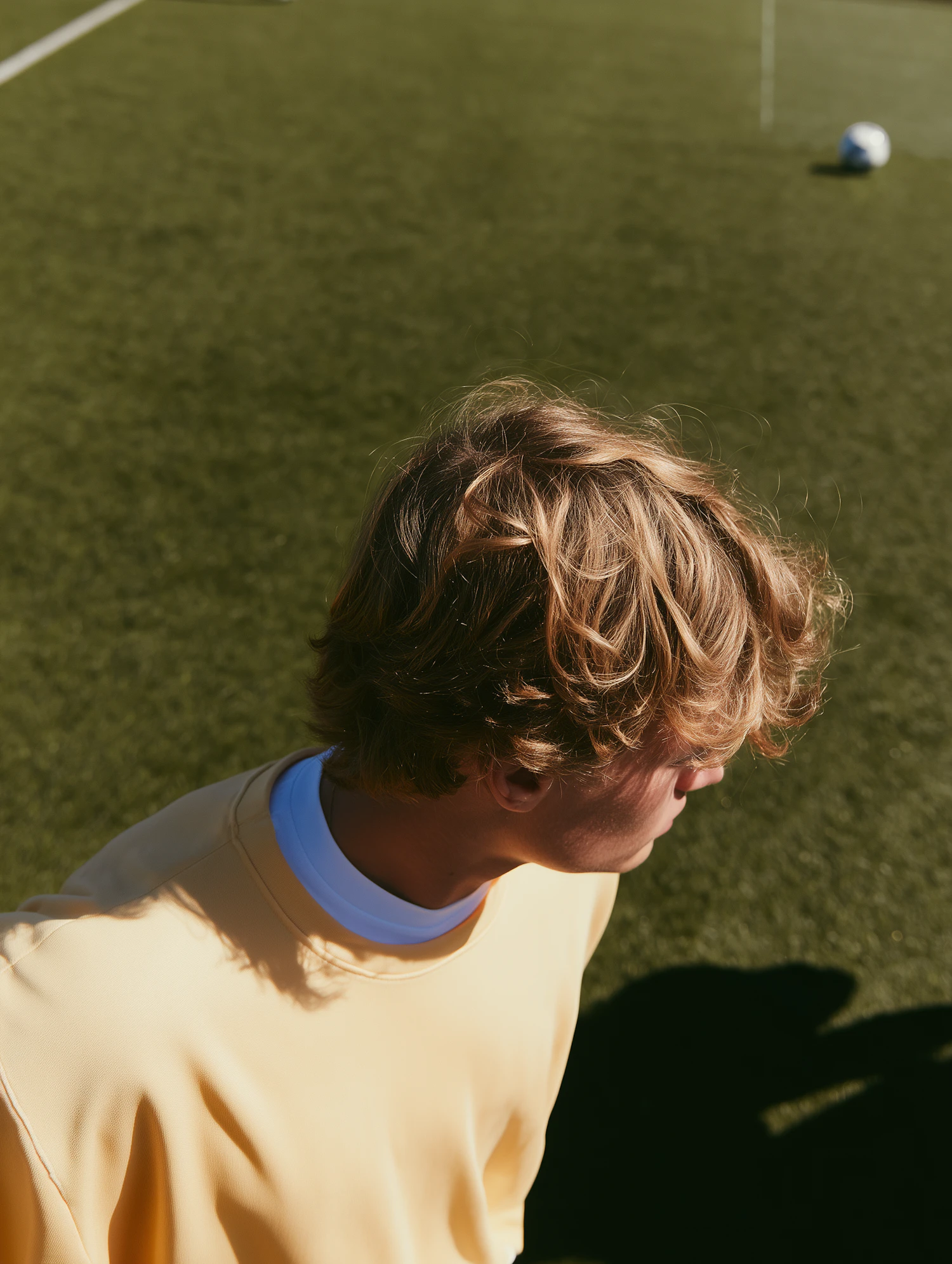 A person with blonde hair in a yellow sweatshirt stands on a sunny sports field, with a soccer ball visible in the background.
